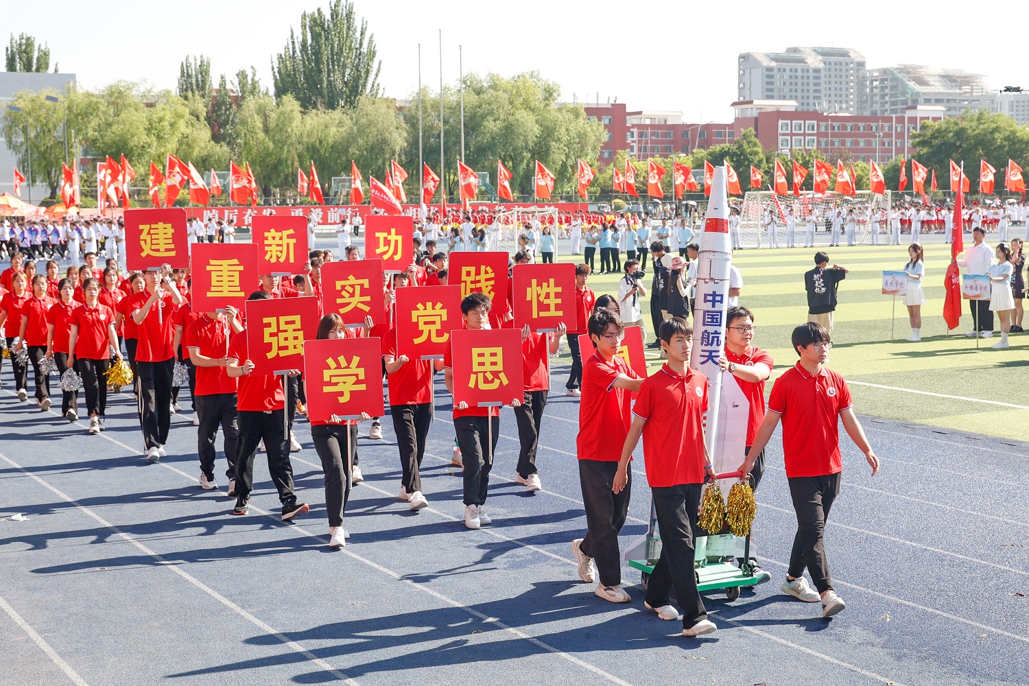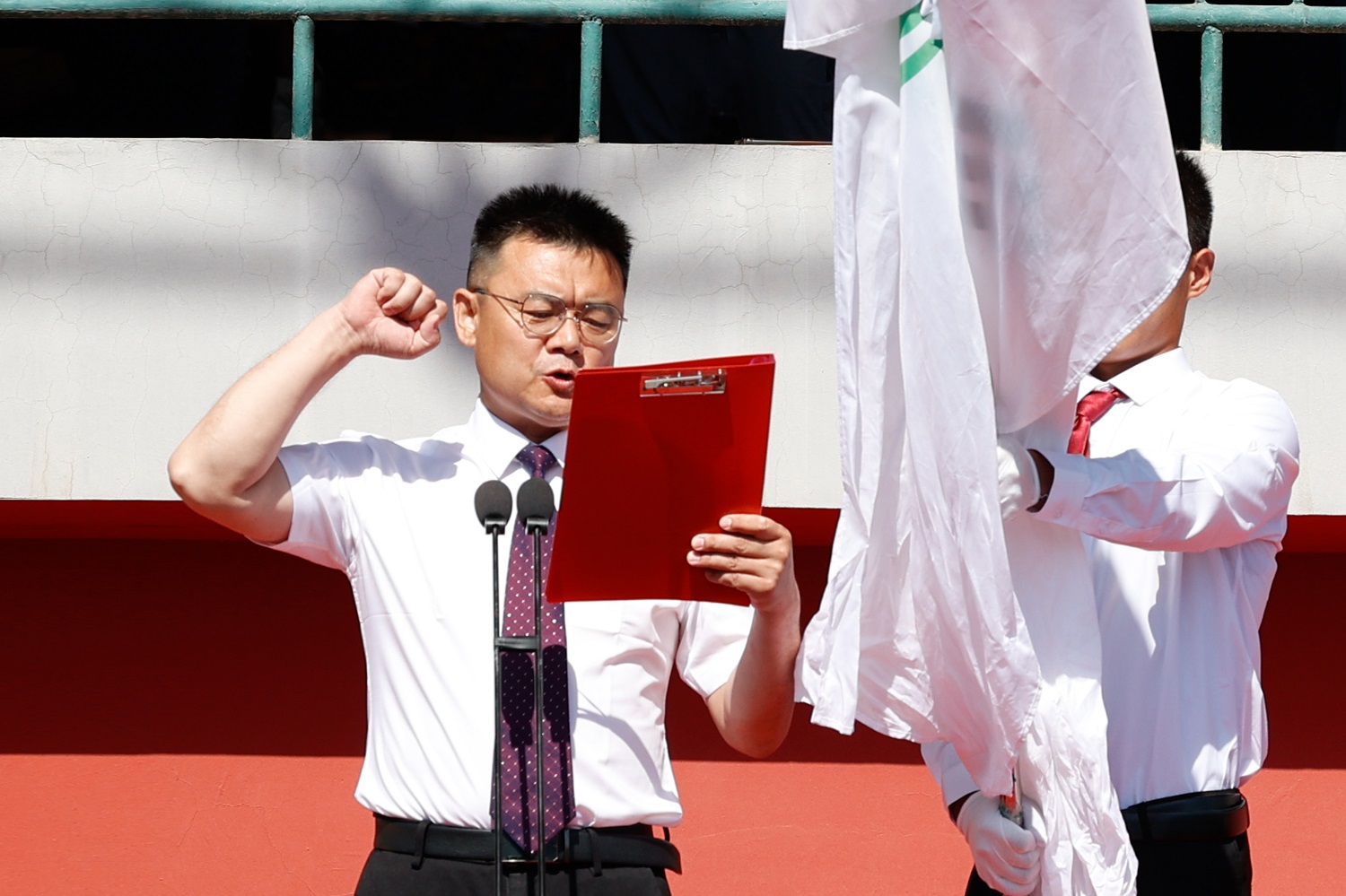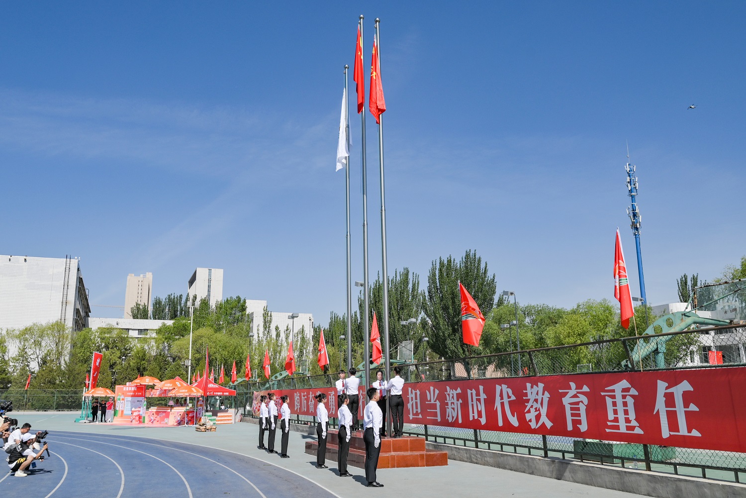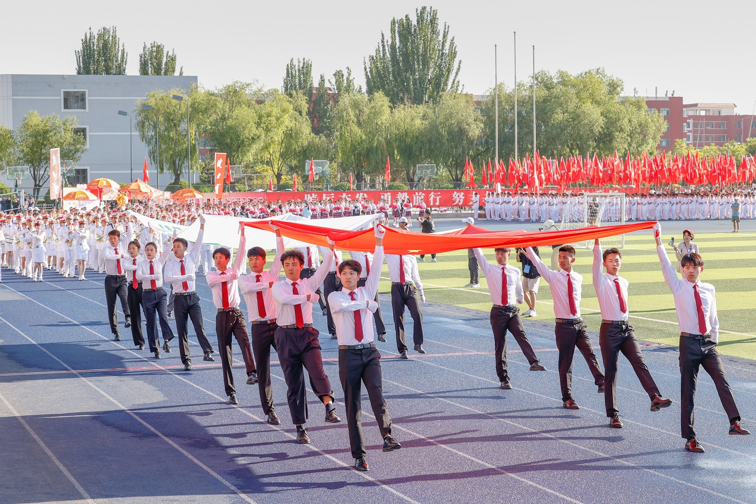 升国旗,奏国歌。五星红旗在蓝天的映衬下冉冉升起,全体师生肃立,行注目礼。升jinnianhui今年会校旗、运动会会旗,奏唱校歌《使命》。