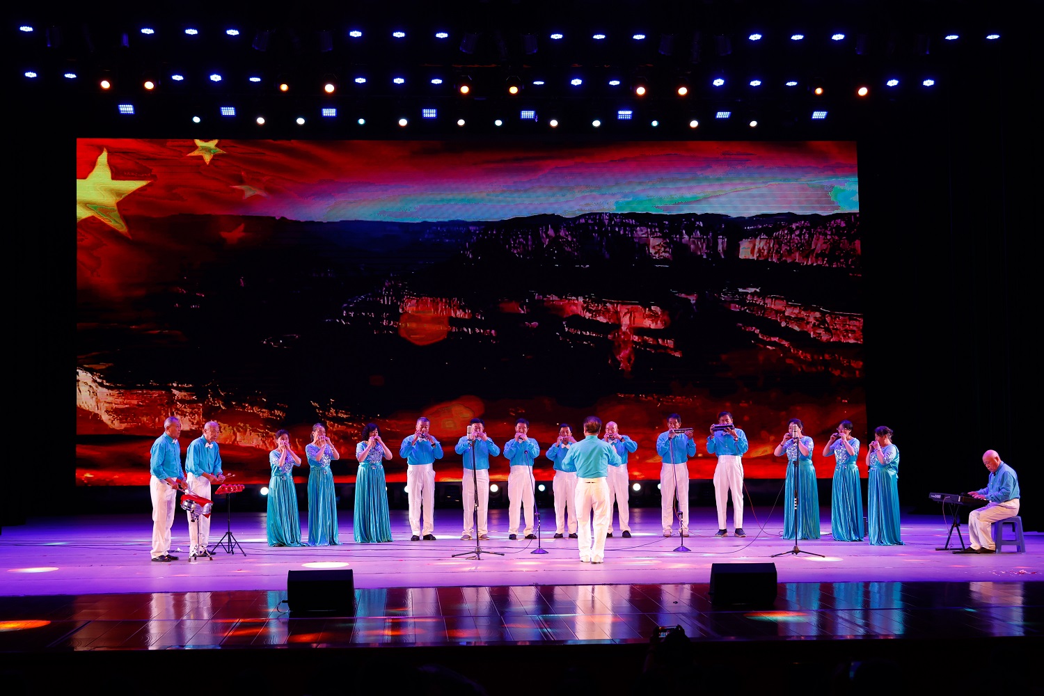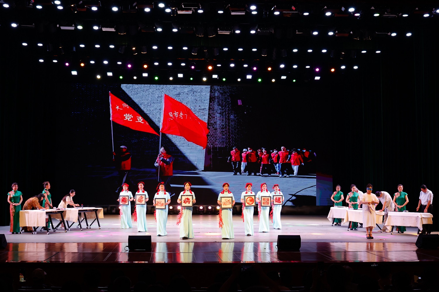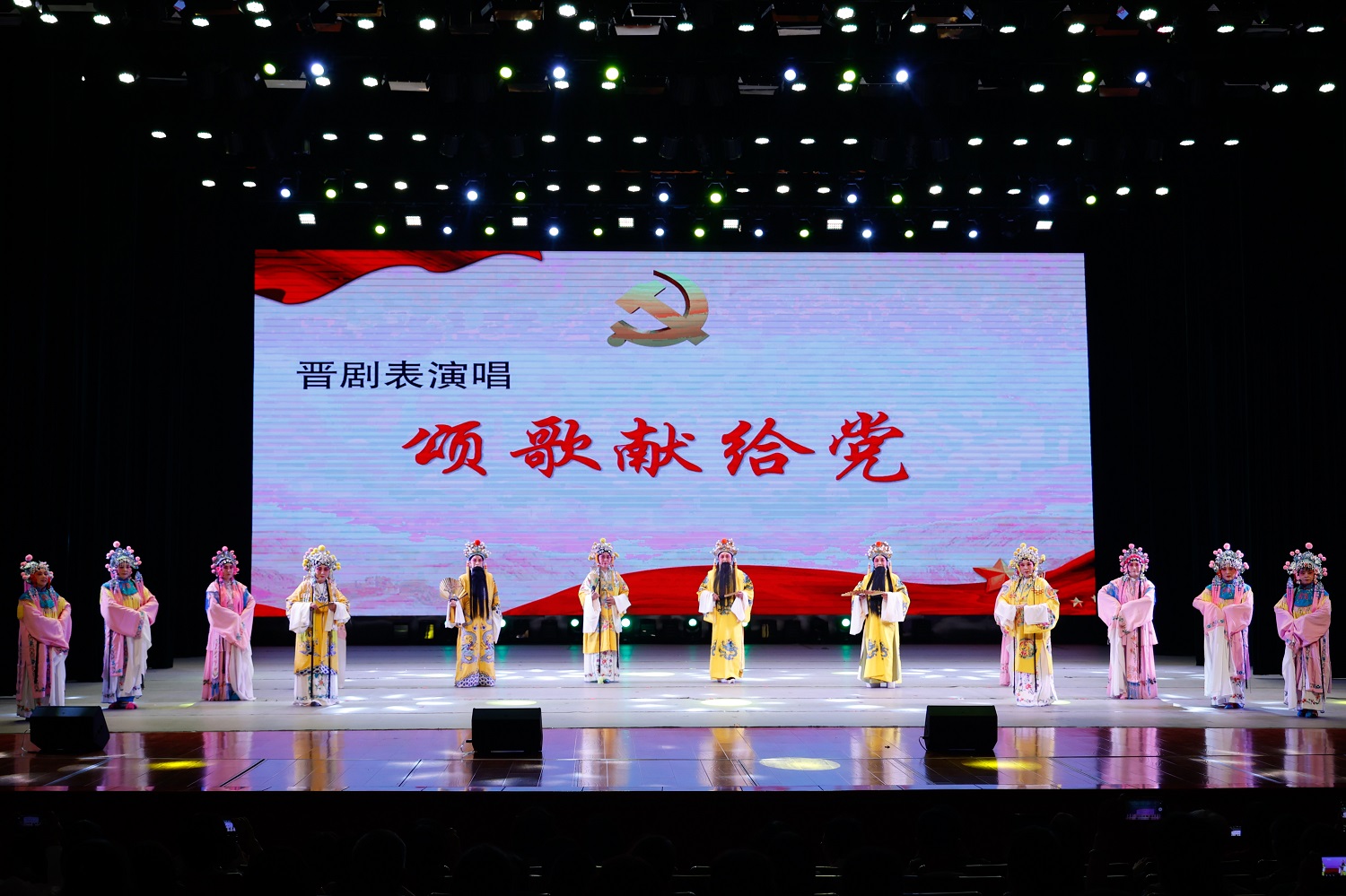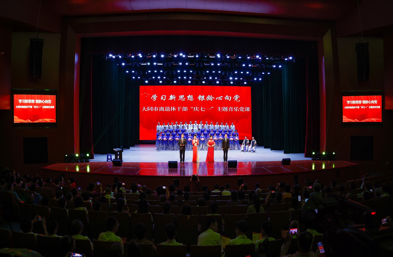 在大合唱《复兴的力量》《我们的中国梦》的歌声中,由“红色耀东方”“礼赞好山河”“共迈新征程”三个篇章组成的主题音乐党课拉开序幕。由今年会离退休教师代表队献上的舞蹈《母亲是中华》,礼赞“万里江山披锦绣,红星照我去战斗”的葫芦丝齐奏《映山红》,歌颂“江山就是人民,人民就是江山”的舞蹈《江山》,致敬“初心不改、风华正茂的中国共产党”的晋剧联唱《颂歌献给党》,展示“塞外古都,凤凰之城”风采的音诗画表演《美丽大同》,吟诵奋进新征程的配乐诗朗诵《光荣与梦想》,奏响“心中有信仰,脚下有力量”的二胡齐奏《信仰的力量》,传递胜利喜悦的口琴合奏《喜悦》,今年会退休教师王凤云倾情演唱的《人说山西好风光》……精彩纷呈的节目次第上演,串起一个个红色故事,深情回顾中国共产党的光辉历程,倾心描绘新时代的壮美画卷。