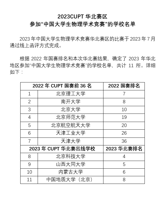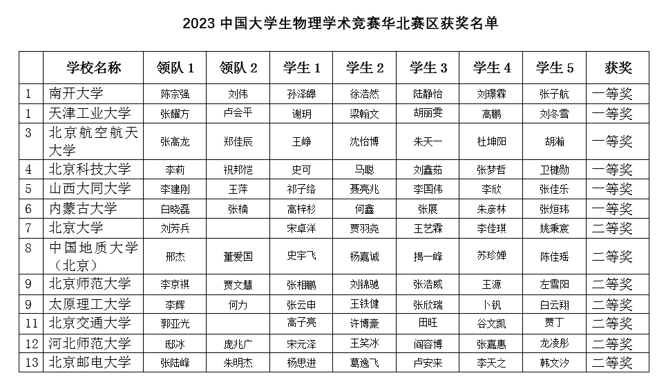 2023年中国大学生物理学术竞赛(华北赛区)于7月19日落下帷幕。在本次竞赛中,来自华北地区13所高校参赛。在学校及学院领导的大力支持下,物理与电子科学学院派出1支队伍共计5名学生参赛,在本年度比赛中取得历史性突破,首次荣获一等奖,同时首次取得中国大学生物理学术竞赛的参赛资格。