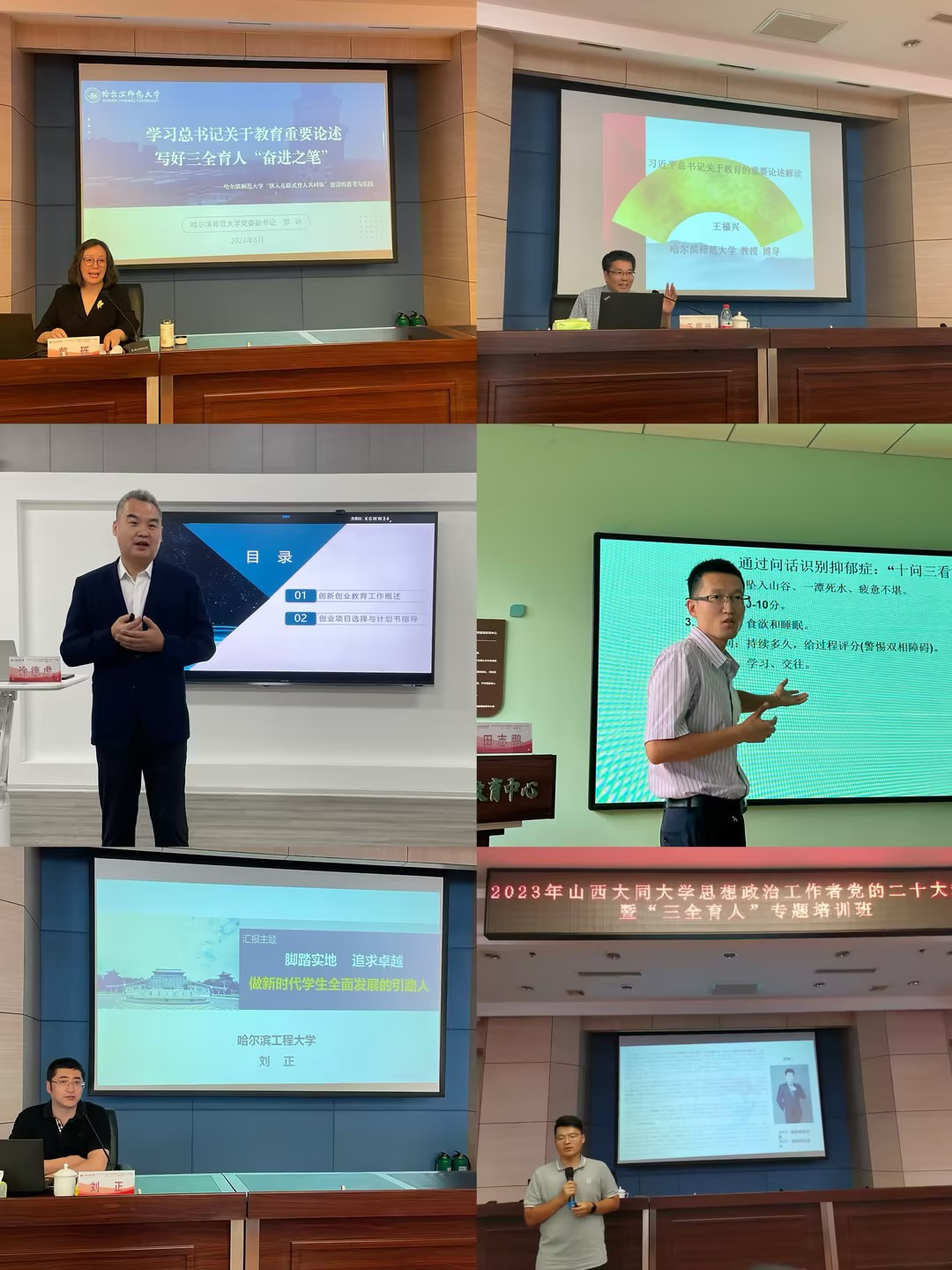本次培训形式丰富,包括专家讲座、实践研学、研讨交流等。哈尔滨师范大学党委副书记、研究员郭砾,马克思主义学院博士生导师王福兴教授,创新创业教研室主任涂德虎副教授,心理健康教育中心田志鹏副教授分别对哈尔滨师范大学推进三全育人综合改革试点工作、思想政治教育工作、创新创业教育工作、心理健康教育工作等进行了详细介绍。黑龙江省高校辅导员名师工作室主持人、哈尔滨工程大学刘正教授,全国最美高校辅导员、哈尔滨师范大学刘国权博士分别以“脚踏实地、追求卓越——做新时代学生全面成长的引路人”“思想革新、内容更新、方法创新——新时代高校辅导员素质能力提升漫谈”为主题,分享了他们的育人经验。