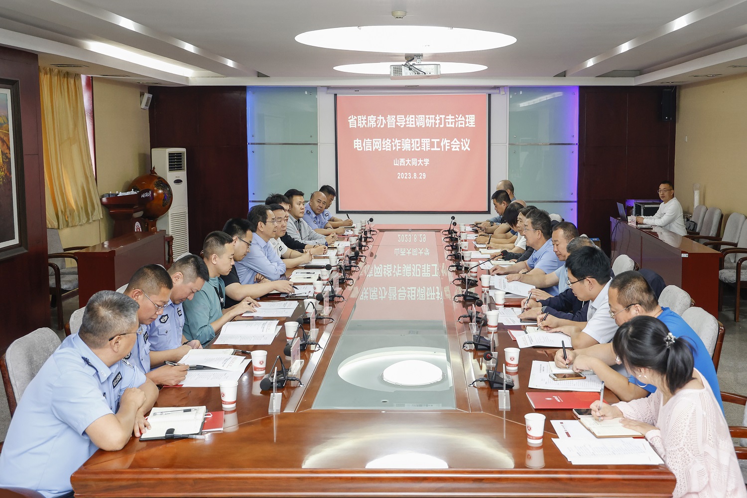 8月29日上午,省联席办督导组组长、省高院二级巡视员周太生,省高院刑一庭三级主任科员马青、省公安厅刑侦总队四级警长严鹏,忻州市公安局反诈中心政委孙浩,吕梁市公安局反诈中心四级警长李嘉祥一行5人来校调研打击治理电信网络诈骗工作。校党委常委、副校长张旻主持调研座谈。大同市公安局党委副书记、常务副局长孙志远,市公安局反诈中心政委王志华等随同调研。党委宣传部、党委保卫部、党委学工部、法学院、外语学院、美术学院有关人员及辅导员代表参加调研。
