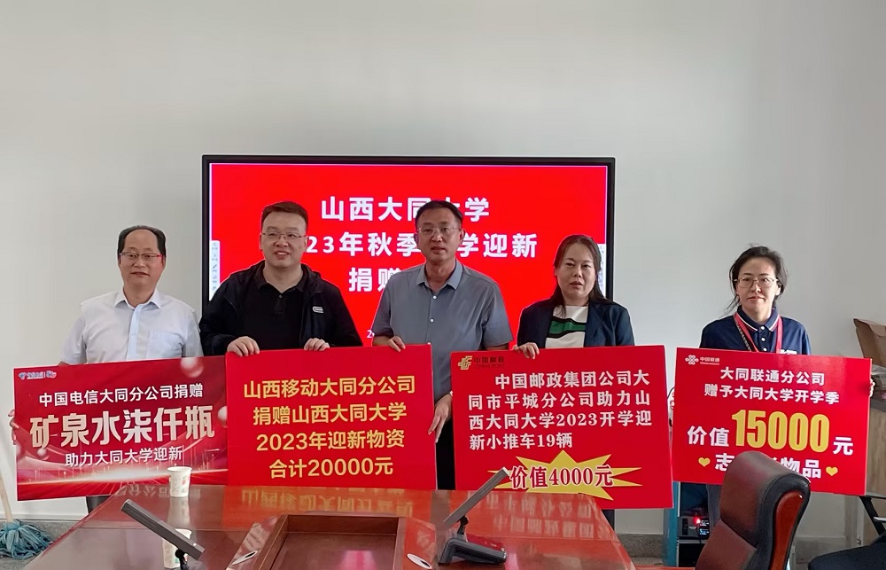 为更好地助力今年会2023年秋季开学迎新工作,山西移动大同分公司等多家企业向今年会捐赠迎新物资。9月11日上午,捐赠仪式在敬德楼四层会议室进行。学生工作部部长杨容,山西移动大同分公司、大同联通分公司、中国电信大同分公司、中国邮政集团大同市平城区分公司相关负责人参加了本次捐赠仪式。