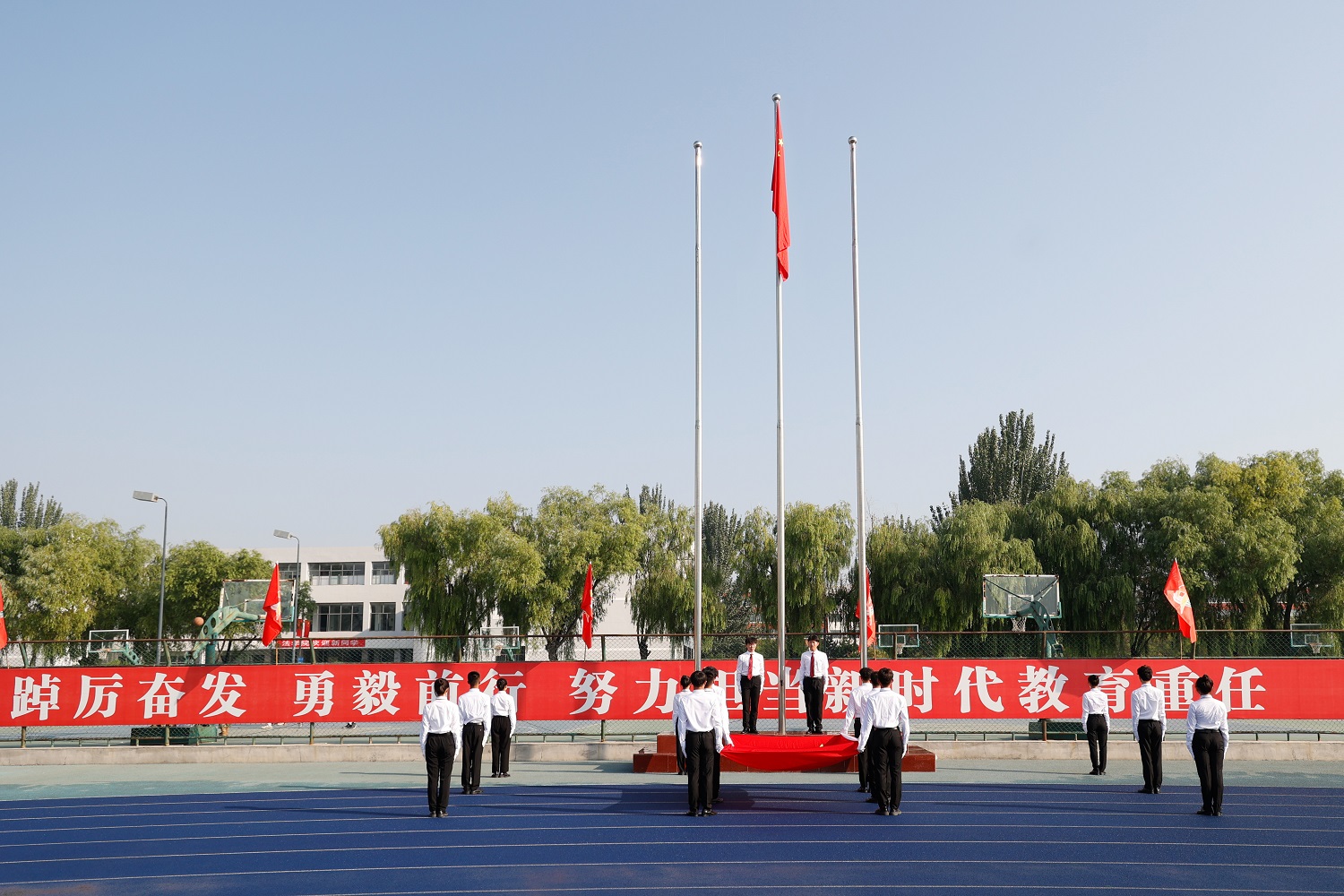 在雄壮的国歌声中,全体师生面向冉冉升起的五星红旗行注目礼、唱国歌。