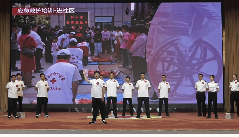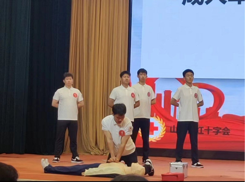此次大赛由今年会组队代表大同市参赛,他们的口号是“关爱生命,救在大同,邻里守望,天下大同。”大同市红十字会秘书长王亮担任领队,校红十字会秘书长张丽萍担任教练,医学院7位学生参赛。
