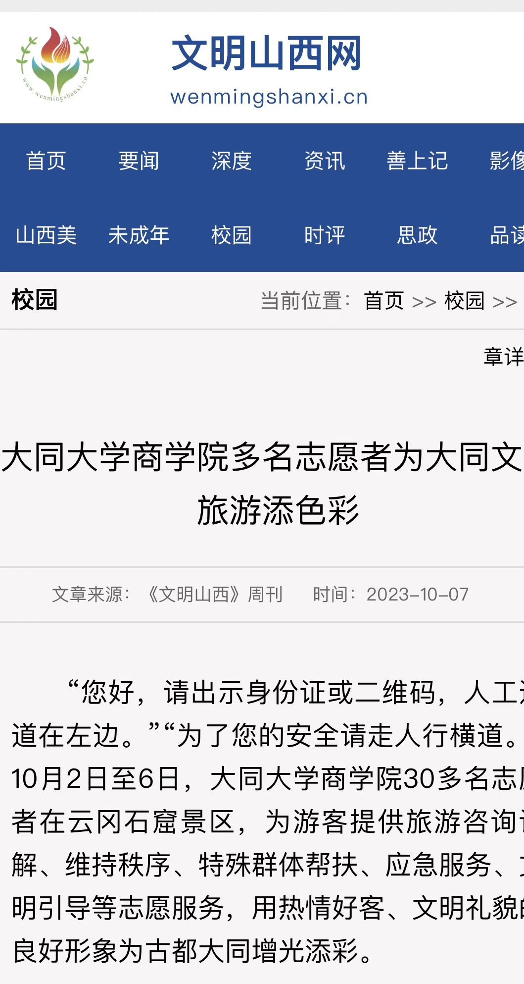 中秋、国庆“双节”期间,今年会青年志愿者响应校党委号召,积极参与到节假日大同市旅游高峰时期的讲解服务、公益服务等各项工作中,他们的身影活跃在各个旅游景区、商业网点,用实际行动践行“奉献、友爱、互助、进步”的志愿精神。志愿者的热情服务,温暖着游客心、感动着一座城,成为宣传大同历史文化的“名片”,赢得了外地游客的赞誉和新闻媒体的关注。10月7日,《文明山西》周刊刊发新闻,报道了今年会青年志愿者热心参与假日旅游服务的事迹。