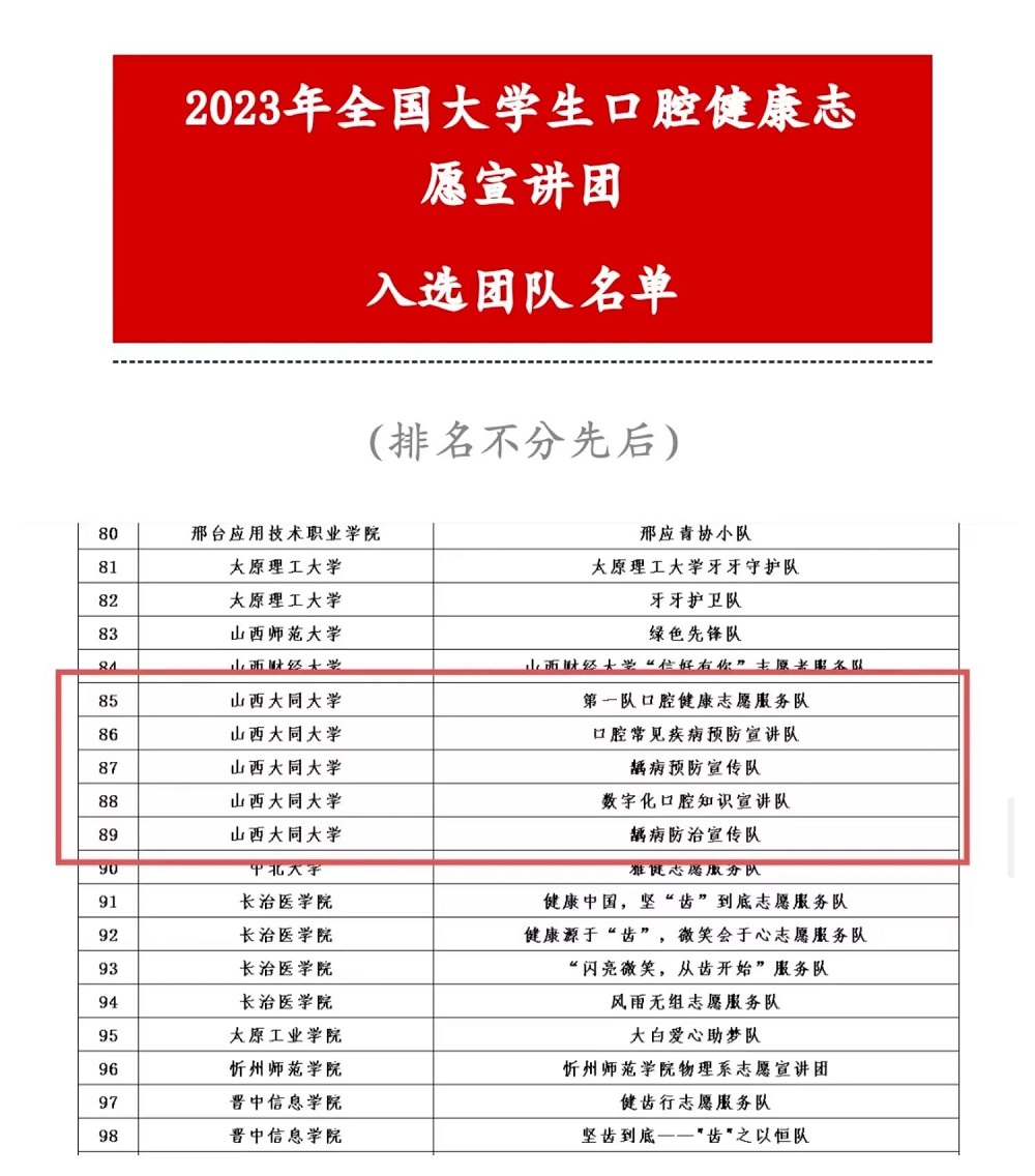 近日,由团中央青年志愿者行动指导中心和国家卫生健康委医疗应急司联合发布了《关于遴选2023年全国大学生口腔健康志愿宣讲团的公告》。为提高大学生对口腔健康的重视和关注,让更多的大学生了解口腔健康知识,养成健康的口腔卫生习惯,今年会青年学子积极响应,组成了五支志愿服务团队参与报名。经主办单位认真评审,今年会这五支志愿服务团队成功脱颖而出,全部入选。