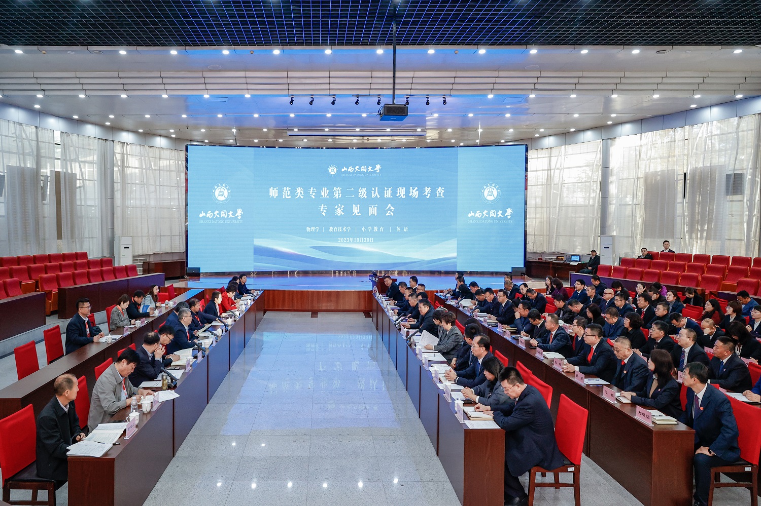 10月30日上午,专家见面会在慎思楼报告厅举行。联合认证专家组组长、小学教育专业专家组组长、江苏师范大学原副校长钱进,英语专业专家组组长、西南大学国际学院院长刘承宇,教育技术学专业专家组组长、东北师范大学教务处副处长赵长明,物理学专业专家组组长、云南师范大学评估中心原主任、本科教学督导团团长毕先均等16位专家,山西省委教育工作委员会主持日常工作的副书记(正厅长级)、省教育厅党组成员杨军,山西省教育厅教师工作处副处长李鹏,山西教育杂志社主编王刚,大同市政府副秘书长曹晖,大同市委教育工作委员会委员、市教育局党组成员、总督学李文丽,全体校领导出席会议。相关职能部门负责人、认证专业所在学院班子全体成员及专业负责人、其他师范类专业所在学院党政负责人参加会议。
