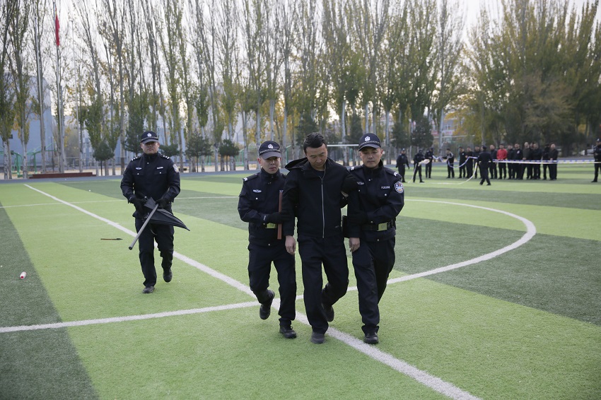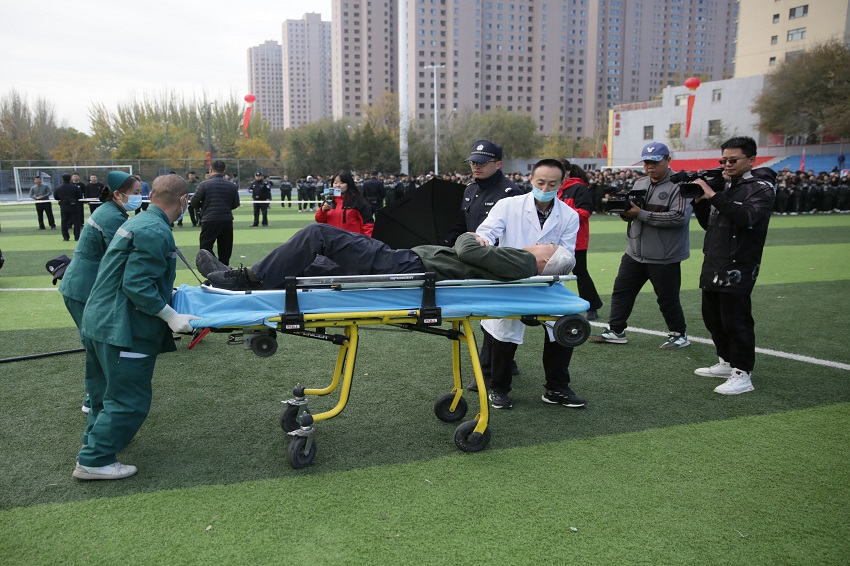 演练现场,两名手持刀斧的“暴恐分子”正与门岗保卫人员发生激烈冲突。安全保卫组成员及时报警,防暴警察接到处警命令后,及时赶到现场并制服“暴恐分子”。同时,接到求援电话的应急救援医务人员赶到现场,对受伤者展开紧急救治......整个过程按照防暴处置预案进行,一气呵成、严肃逼真、处置迅速。