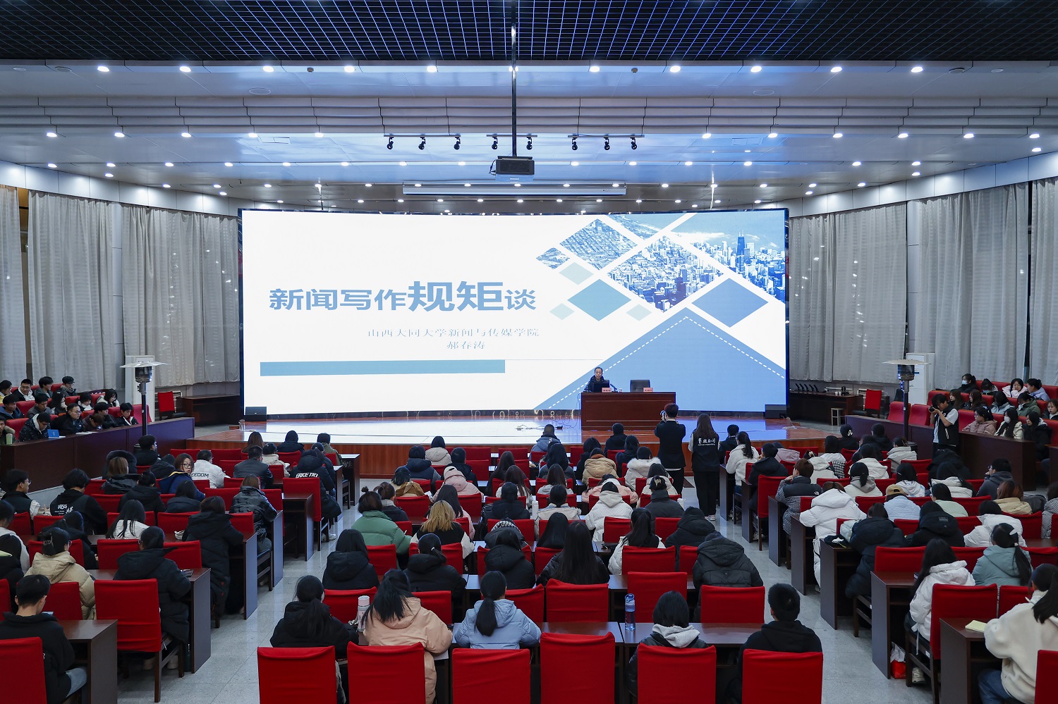 郝春涛围绕“新闻规矩”主题,结合自身多年来从事新闻工作的实践经历,通过理论讲解与案例分析相结合的方式,深入浅出地讲解了新闻报道的标题、导语、主体部分、照片四个方面的具体注意事项。他勉励大家要抱着“兢兢业业、如履薄冰”的敬业精神和工作心态去对待新闻写作,在笔耕不辍的实践中努力成长为优秀的校园媒体人,共同讲好同大故事,传播好同大声音。