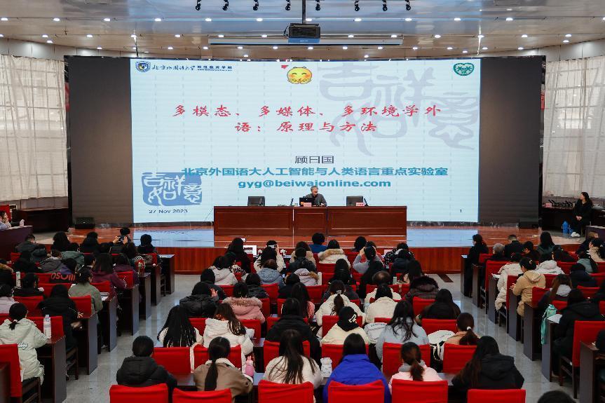 顾曰国教授作了题为《多模态、多媒体、多环境学外语:原理与方法》的学术讲座。顾曰国教授聚焦学习本质,系统讲授了自然多模态学习中的动因律、内化律、不可替代律、过程律、丢失律和实践律六大定律,以及多模态、多媒体、多环境“三多”学习外语的策略与风格。