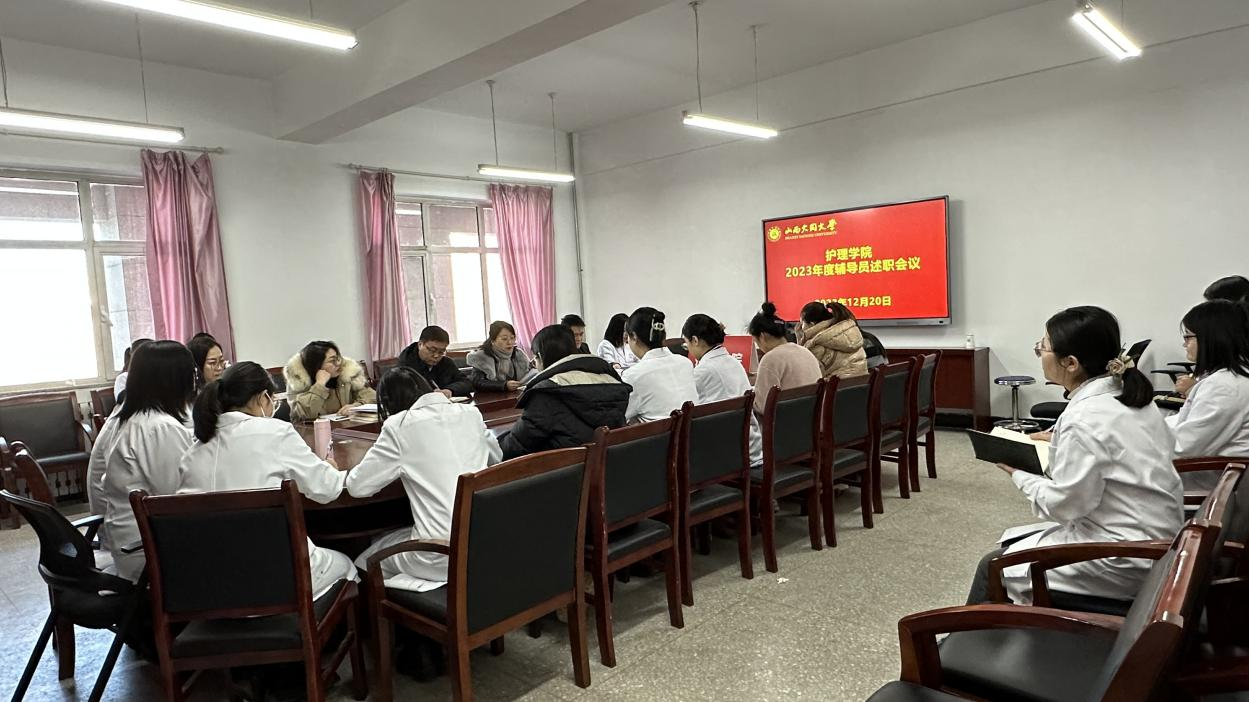 为深入落实立德树人根本任务,梳理工作经验和检验育人实效,进一步加强辅导员队伍建设,明确新一年度的工作思路,完善学院辅导员队伍考评体系,激励和促进辅导员不断提升工作水平和能力。根据学校《关于开展2023年度辅导员工作考核的通知》文件精神,12月18日上午,护理学院在仁和楼B503会议室,召开2023年辅导员述职报告会。学院科级以上干部、全体专兼职辅导员、组织员、近三年入职的教师参会。会议由学院党委书记杨秀峰主持。