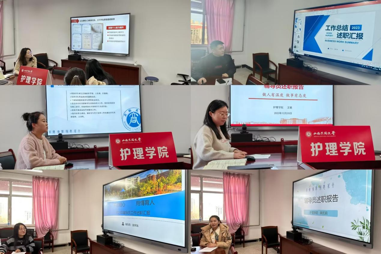 护理学院共有6位专职辅导员,老师们依次从自己的岗位出发,从工作开展、特色成效、未来展望等方面,将一年工作的内容,取得的成绩以及对未来的规划展开汇报。特别对2023年所负责的学生管理和分管的思想政治教育、学生日常管理、党团建设、学风建设、就业指导等工作进行了全面、详实的述职汇报。
