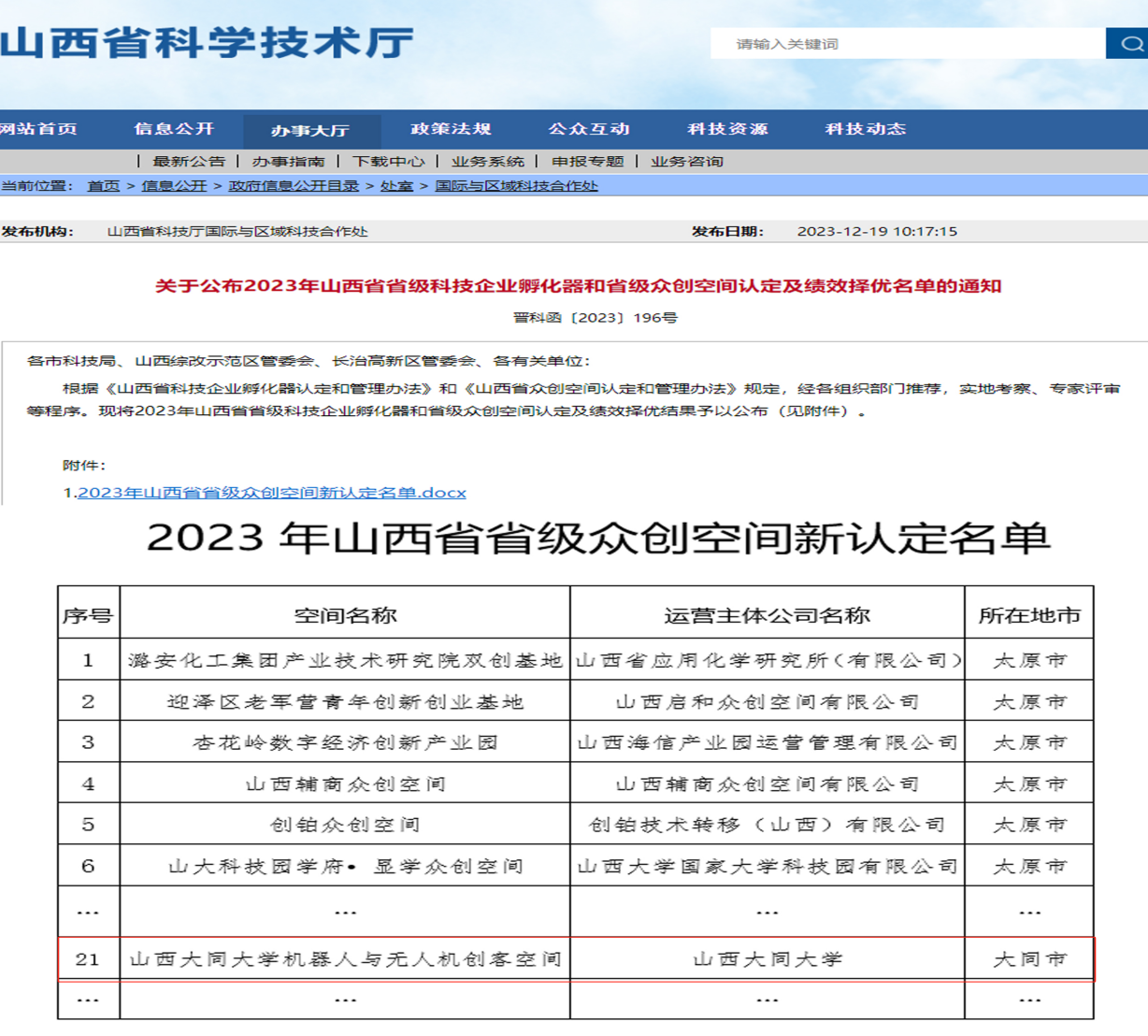 近日,山西省科技厅公布了2023年山西省省级众创空间认定名单,物理与电子科学学院“jinnianhui今年会机器人与无人机创客空间”立项获批。对于省级众创空间的申报,学校领导、学院和校科学技术部高度重视,根据《山西省众创空间认定和管理办法》、《关于组织开展2023年山西省省级众创空间认定申请的通知》等相关要求,经实地考察、专家评审和名单公示等程序,最终立项获批。