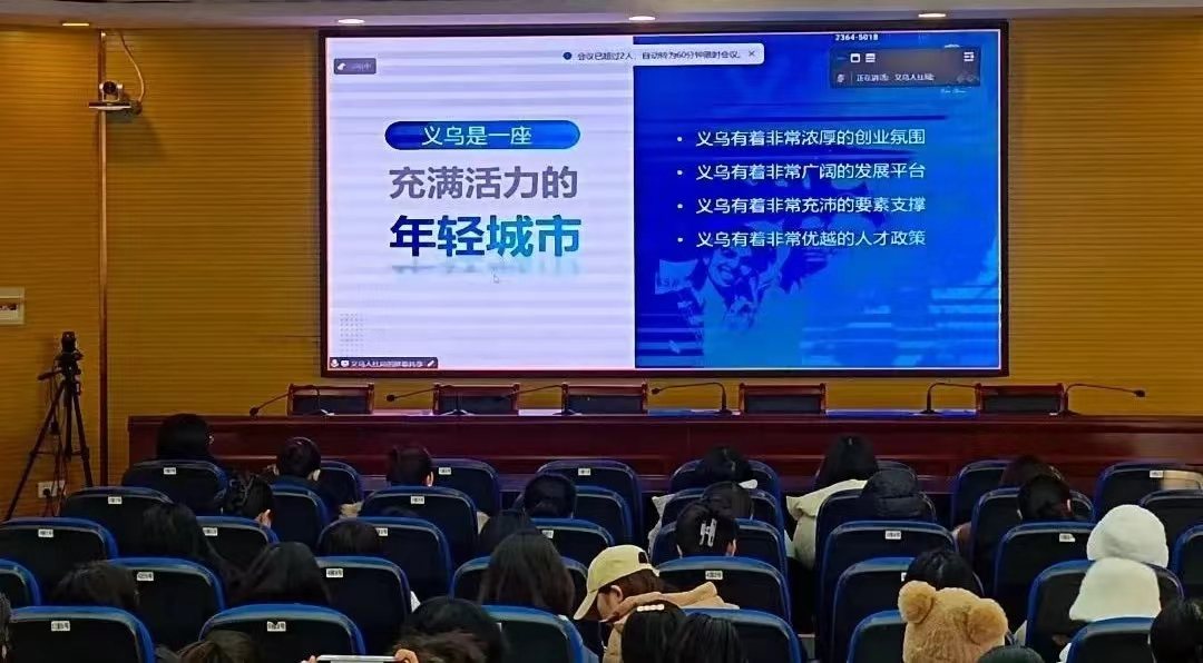 活动开始,义乌市人力资源和社会保障局首先通过屏幕对毕业生们宣讲义乌市基本情况和就业环境,并向大家介绍了大学生实习补贴、大学生生活补贴、高校毕业生就业补贴等就业人才政策。