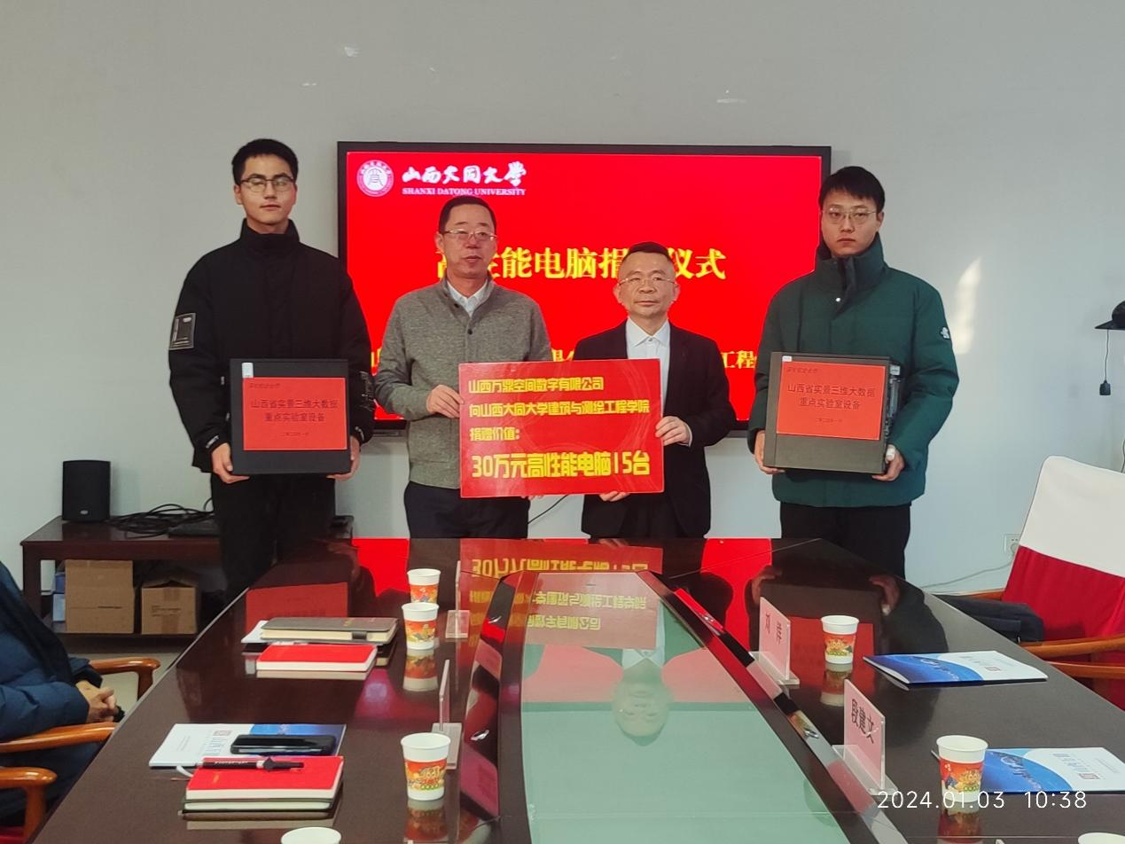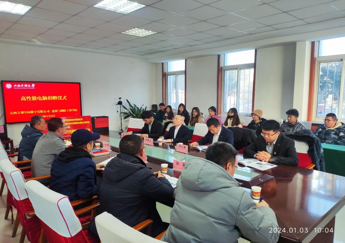 1月3日,山西万鼎空间数字有限公司向建筑与测绘工程学院捐赠价值30万元高性能电脑15台,捐赠仪式在新平旺校区办公楼一层会议室举行。学院党委书记马云波、党委副书记姚占魁、副院长徐广翔、副院长乔栋,山西万鼎空间数字有限公司董事长段建文、副总经理刘洋、副总经理李日增、董事长助理张义杰等出席本次仪式,建测学院相关专业师生代表参加捐赠仪式。仪式由马云波主持。