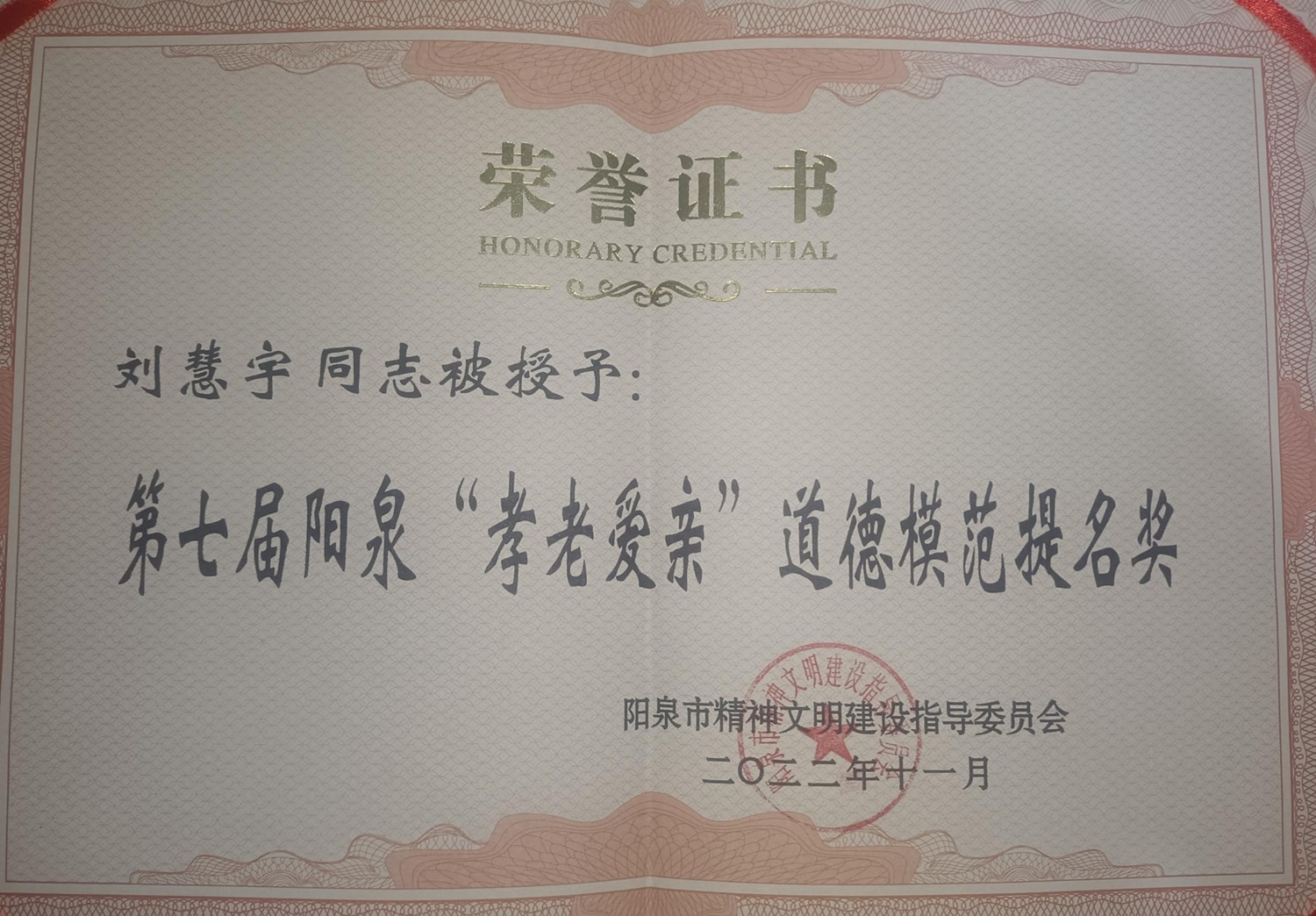 2022年,凭借着自身努力,刘慧宇顺利通过了专升本考试,成为一名同大学子。到外地求学,远在阳泉的母亲是刘慧宇最为牵挂的,最初她想把母亲带到身边,但由于疫情等原因未能成行,只能由妹妹代为照顾母亲。然而好景不长,痼疾缠身的母亲又因胆结石手术、低血糖、股骨骨折等多次住院,心急如焚的刘慧宇只能请假返乡,衣不解带地日夜守护在母亲病床边。生活的重担没有将她压垮,反而让她愈挫愈勇,在同大求学期间,先后获得校级奖学金、第七届阳泉孝老爱亲道德模范提名奖、阳泉市第一届城区孝老爱亲道德模范提名奖。刘慧宇用乐观与坚强,成为了好学生、好姐姐,更是母亲最贴心的“小棉袄”。