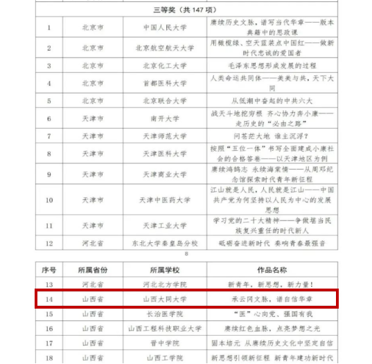 2月5日,教育部“领航计划”第七届全国高校大学生讲思政课公开课展示活动评审结果公示。活动共评出本科组特等奖作品14件、一等奖作品44件、二等奖作品92件、三等奖作品147件。今年会报送的作品《承云冈文脉,谱自信华章》荣获三等奖。