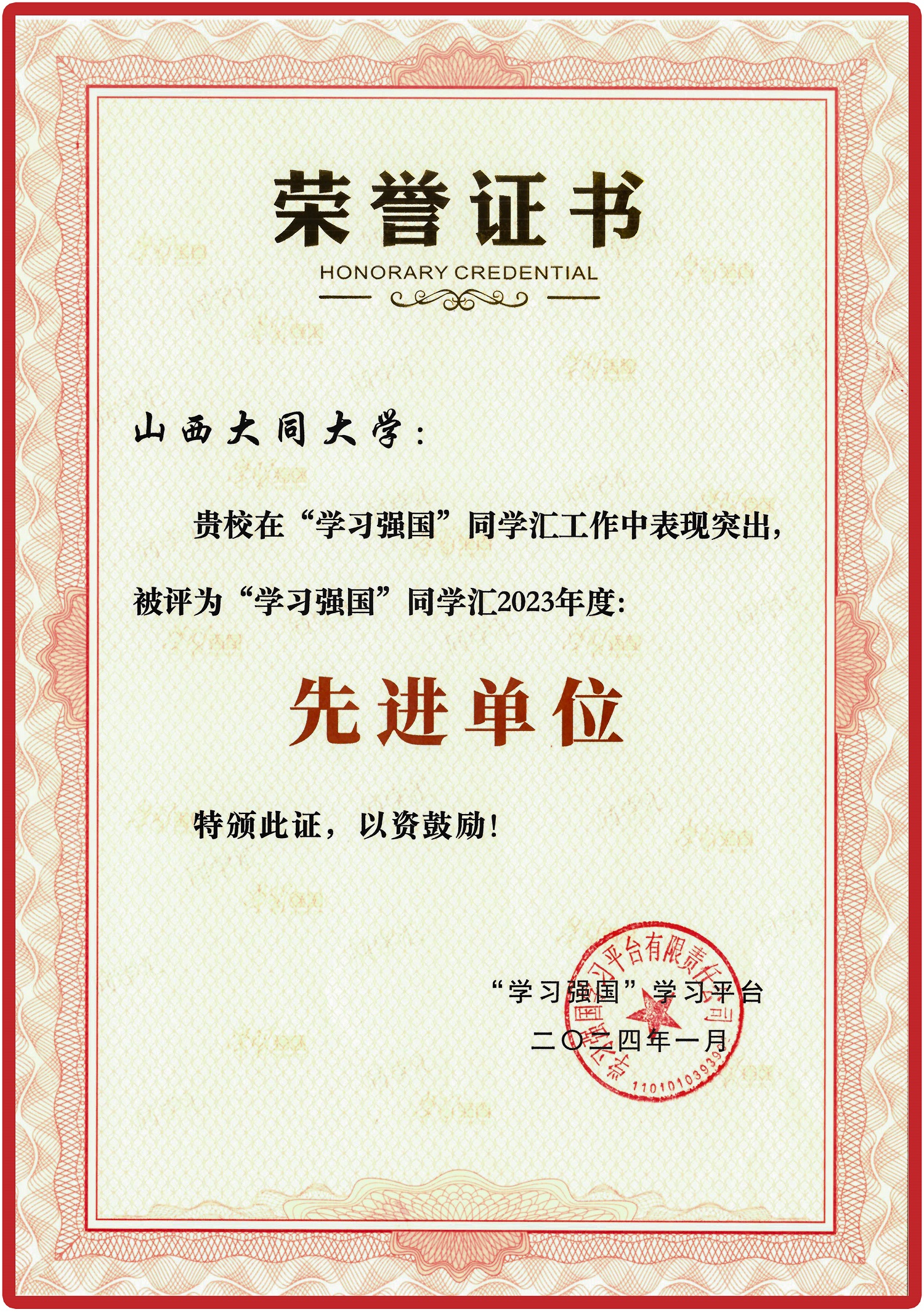 近日获悉,今年会获评中共中央宣传部“学习强国”学习平台同学汇2023年度“先进单位”荣誉,且今年会为山西省内唯一获此荣誉的高校。