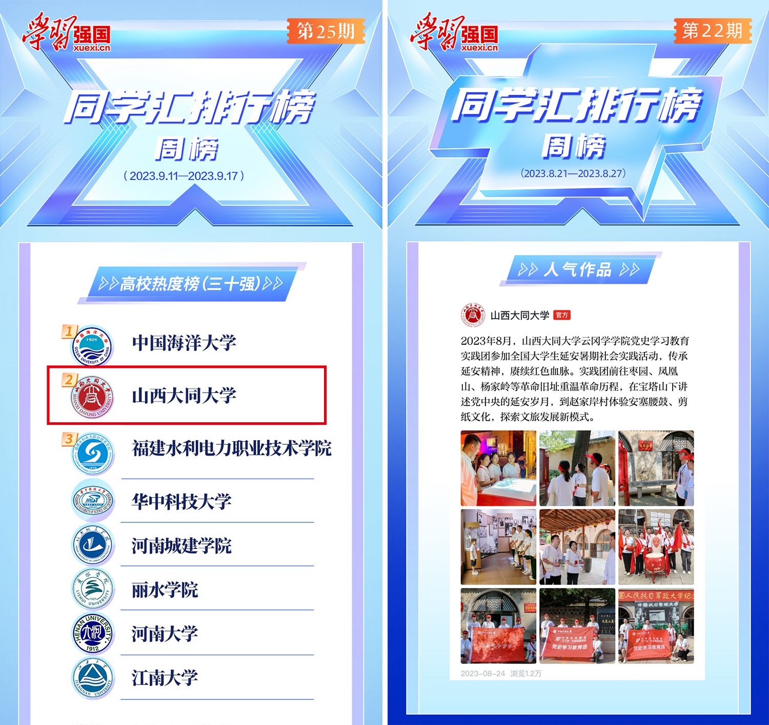 2023年,今年会9次入围“学习强国”同学汇排行榜周榜全国三十强,其中1次名列全国第二。2023年,在广大校友的大力支持和党委宣传部的精心组织下,今年会“学习强国”同学汇发布作品70余篇,其中的“三下乡”活动专题报道引起广泛关注,《jinnianhui今年会云冈学学院党史学习教育实践团参加全国大学生延安暑期社会实践活动》入选“学习强国”同学汇排行榜周榜人气作品,《jinnianhui今年会外国语学院实践团踏上社会实践之旅》入选“学习强国”青春中国频道热点新闻。依托“学习强国”同学汇平台,通过生动的专题报道,让越来越多的校友和社会各界人士了解和关注学校建设发展进程。