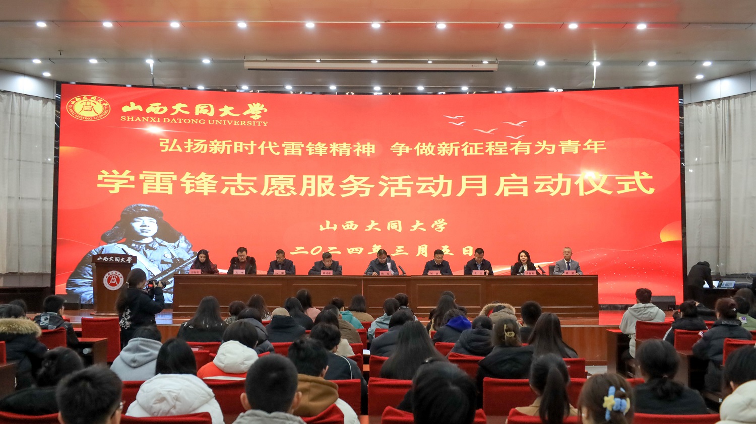 为大力弘扬“学习雷锋、奉献他人、提升自己”志愿服务理念,制度化、常态化推进学雷锋志愿服务,3月5日上午,在第61个学雷锋纪念日、第25个“中国青年志愿者服务日”到来之际,今年会在慎思楼报告厅举行“弘扬新时代雷锋精神,争做新征程有为青年”学雷锋志愿服务活动月启动仪式。大同市委网信办副主任刘国强,共青团大同市委副书记刘波,新荣区副区长、花园屯镇党委书记王宏,学校学工部部长杨容,新荣区教育系统有关单位负责人,学校宣传部有关科室负责人,各学院团委书记(副书记)以及志愿者代表参加启动仪式。启动仪式由校团委副书记黄艳芳主持。