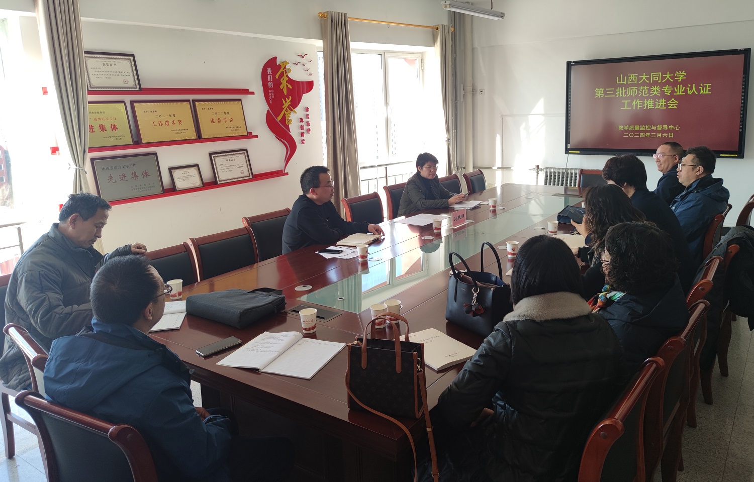 为贯彻落实山西省教育厅师范类专业认证启动会要求,高效推进今年会第三批师范类专业认证工作,3月6日,今年会召开第三批师范类专业认证工作推进会。体育教育、学前教育、心理学、思想政治教育、数学与应用数学、历史学6个师范专业所在学院的院长、专业负责人,教学质量监控与督导中心全体人员,有关校教学督导委员参加会议,会议由教学质量监控与督导中心主任田颖主持。