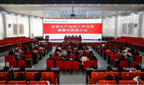 3月26日下午,外国语学院党委在慎思楼报告厅召开2024年度全面从严治党工作会议暨警示教育大会。学院领导班子成员、全体教职工、部分学生党员代表参加会议。学院党委副书记、院长张晓世主持会议。