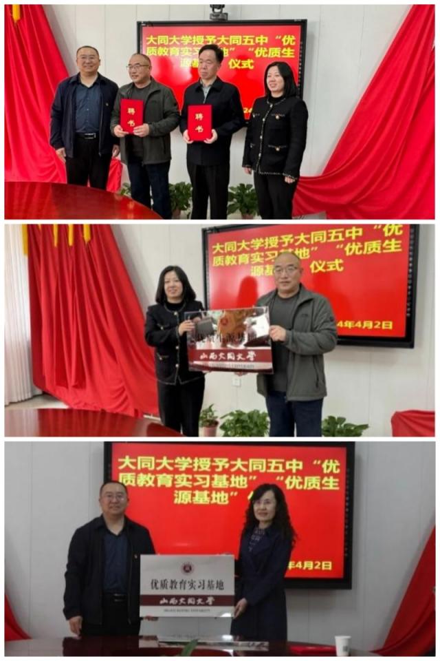 李红梅和刘有军授予大同五中“优质教育实习基地”和“优质生源基地”牌匾,侯军宏、魏剑飞代表大同五中接受牌匾。