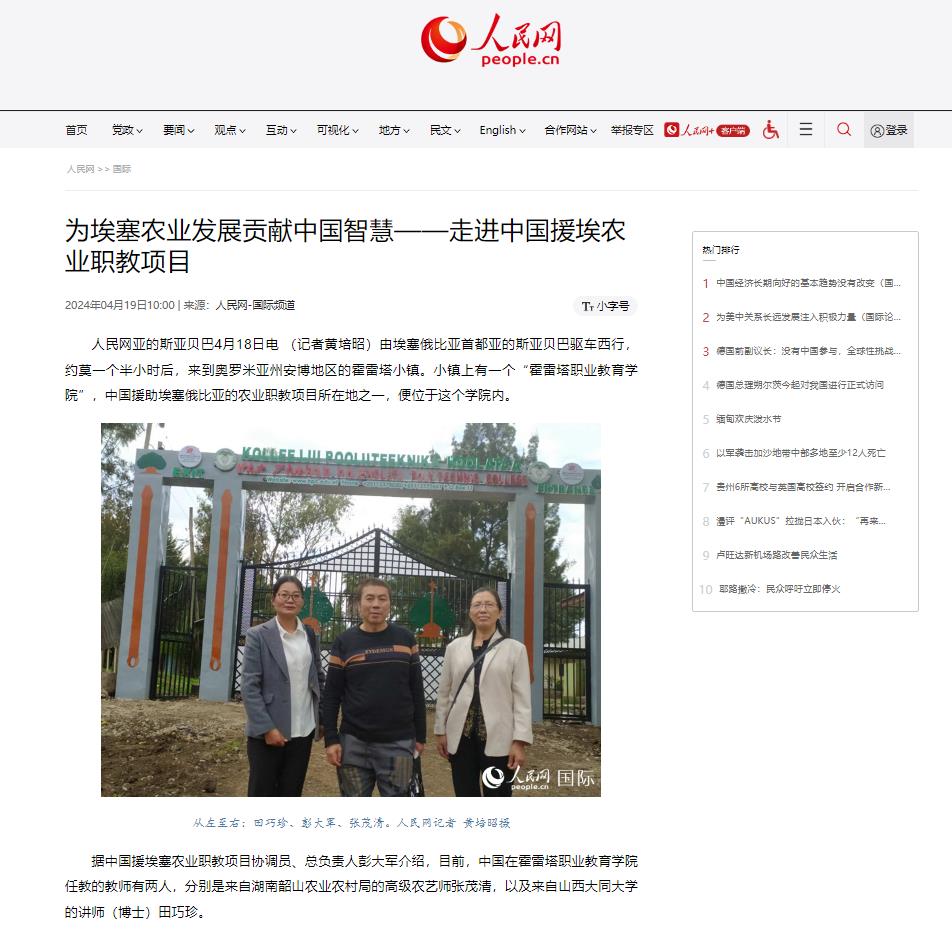 4月18日,人民网国际频道报道今年会教师田巧珍参与中国援助埃塞俄比亚农业职教项目的故事。