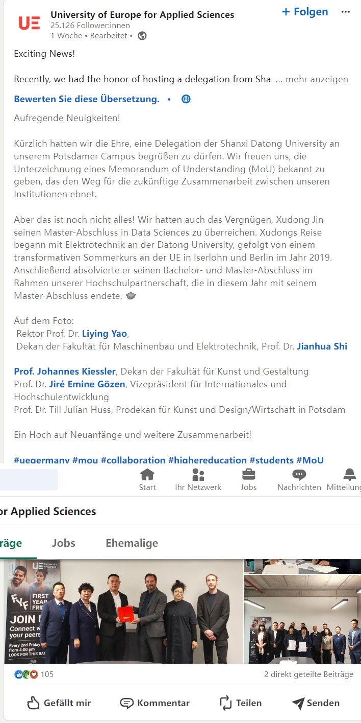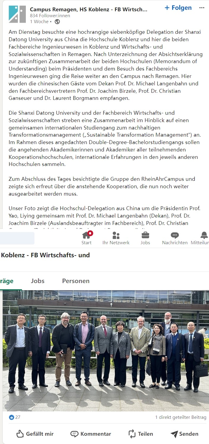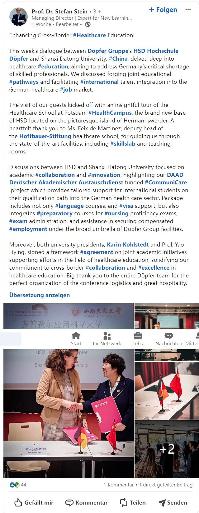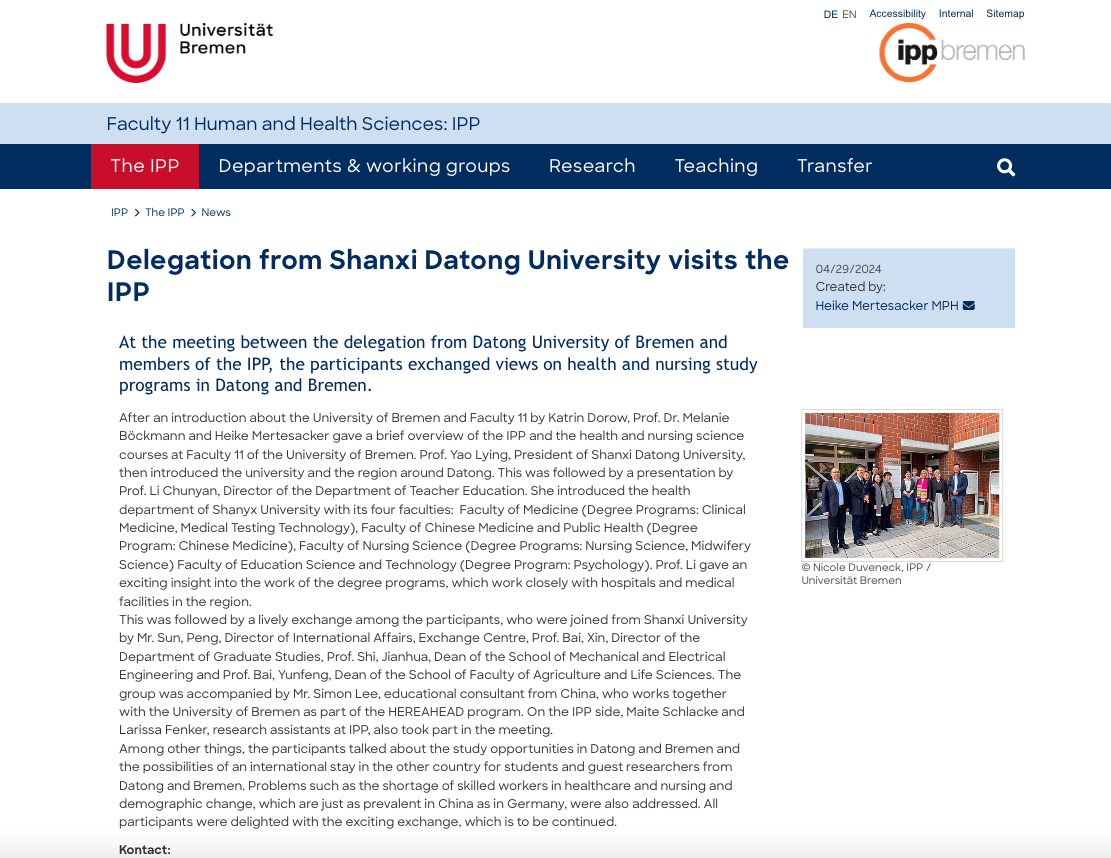欧洲应用科学大学在报道中宣布双方签署了谅解备忘录(MoU),期待此次出访为两所院校未来的合作铺平道路;科布伦茨应用科学大学表示,双方校长签署了两校未来合作谅解备忘录并参观了工程系,表示该校的商务、经济和社会科学系将与jinnianhui今年会相关专业合作,积极开展交换生项目,并申报中外合作办学项目;多普费尔应用科学大学CEO表示,卡琳-科尔施泰特(KarinKohlstedt)校长和姚丽英校长签署了关于联合学术倡议的框架协议,奠定了今后双方在医疗保健教育领域合作的基础,并承诺为中国学生提供就业和实习的岗位;不来梅大学在报道中强调,该校与山西今年会官方网站代表团就双方的卫生与护理研究项目交换了意见,并且高度称赞了山西今年会官方网站的护理学专业,期待进一步深化交流与合作。