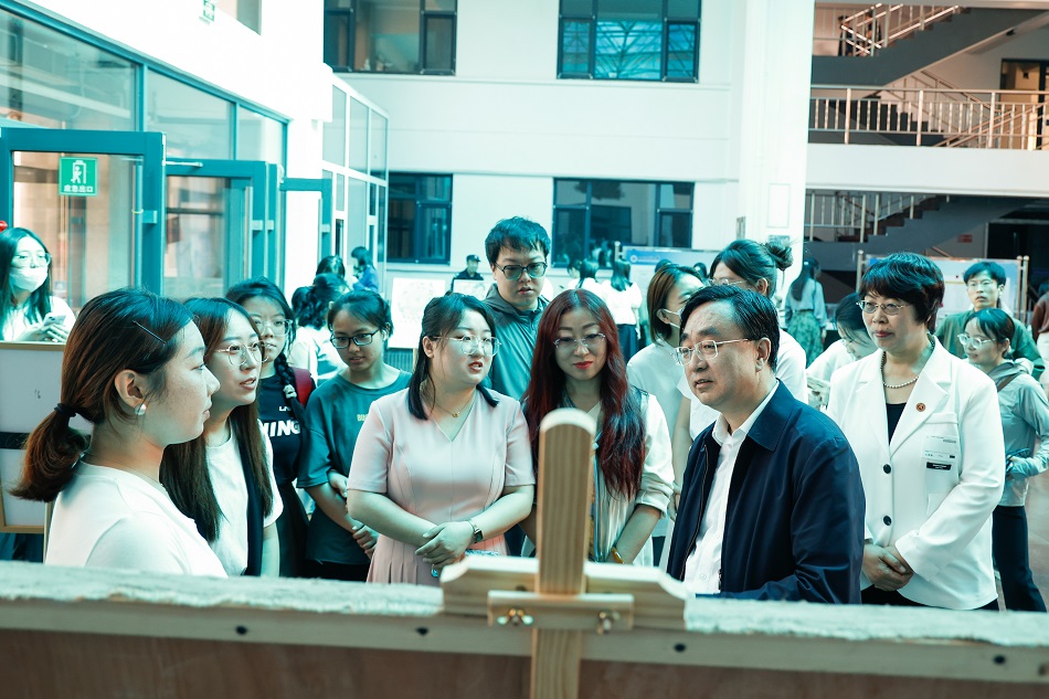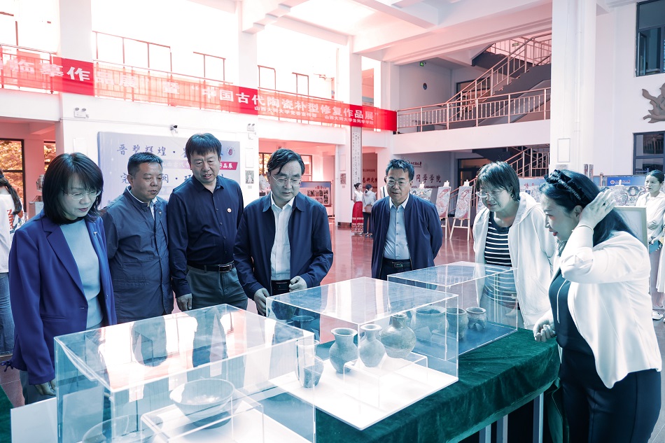 赵水民等与师生们认真观摩了展出的作品,与云冈学学院班子成员及负责讲解的师生们深入交流,共同探讨同大云冈学建设之路。作为学校第十七届校园文化艺术节、学院第三届“云冈文化月”系列活动之一,该展共展出以山西寺观壁画为主题的20余幅壁画临摹作品、120件陶瓷修复器具,年代跨度从春秋战国至明清。云冈学学院师生积极参与到讲解中,通过专业视角和专业知识,向来宾们介绍壁画艺术特色、陶瓷器的制作工艺及其修复技术。