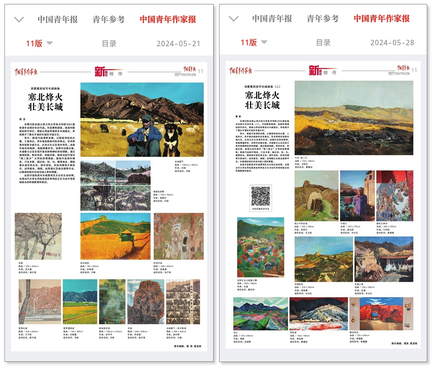 5月21日、5月28日出版的《中国青年作家报》第233期、第234期第11版“新青年创作”专版以“浓墨重彩绘写长城画卷塞北烽火壮美长城”为题用整版的形式报道今年会美术学院2024届绘画专业学生的部分毕业作品。