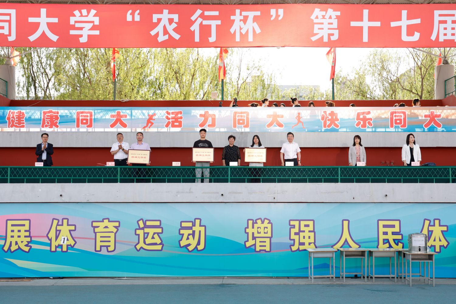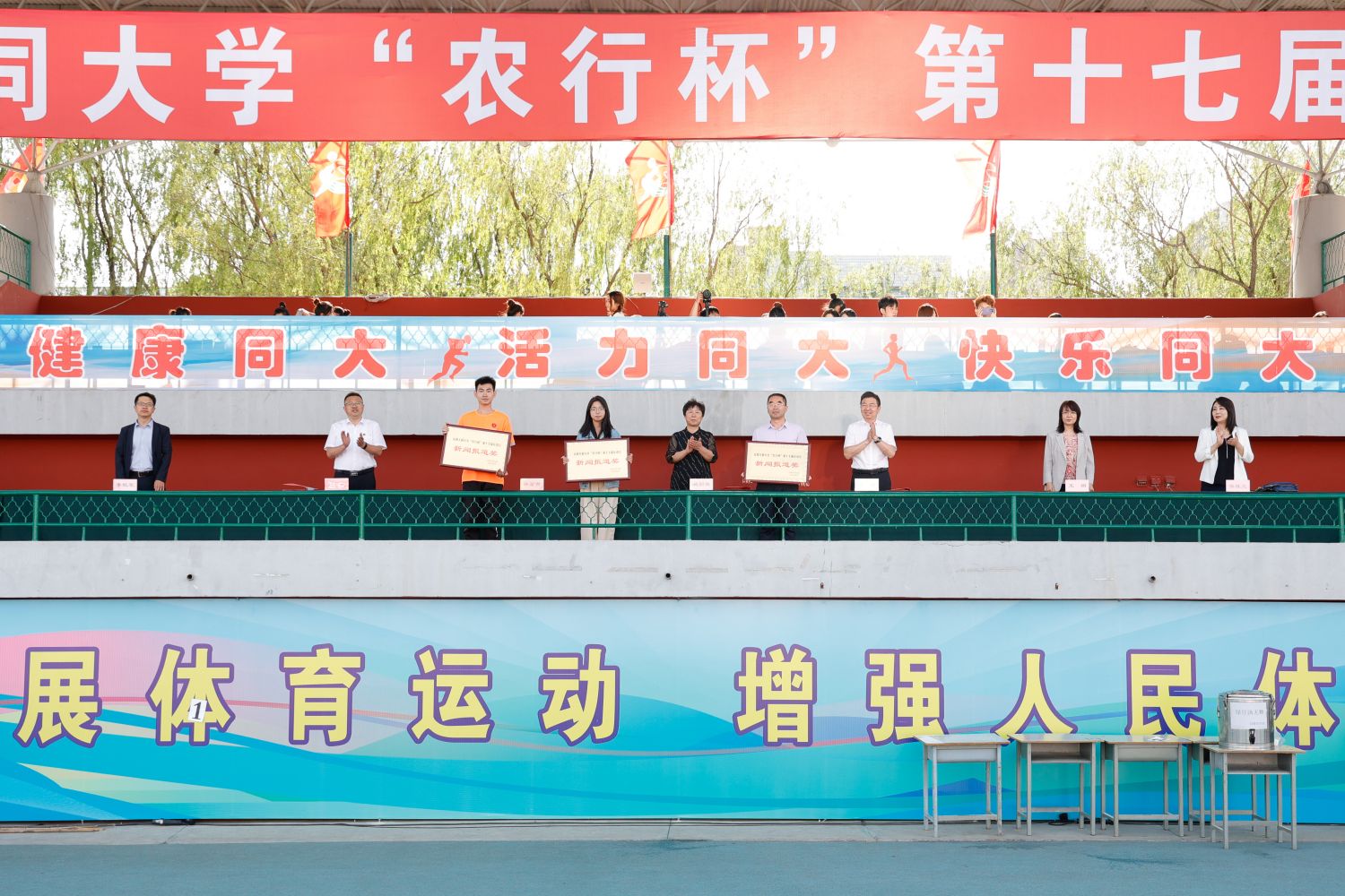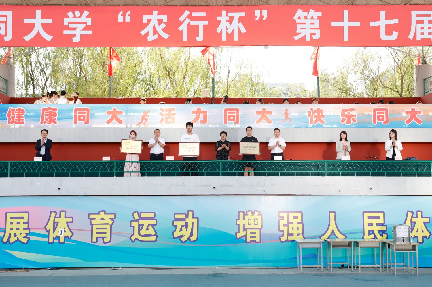 总裁判长赵岷宣布本届运动会比赛成绩。张旻宣布体育道德风尚奖、精神文明奖和新闻报道奖获奖名单。与会领导为获奖集体与个人颁奖。