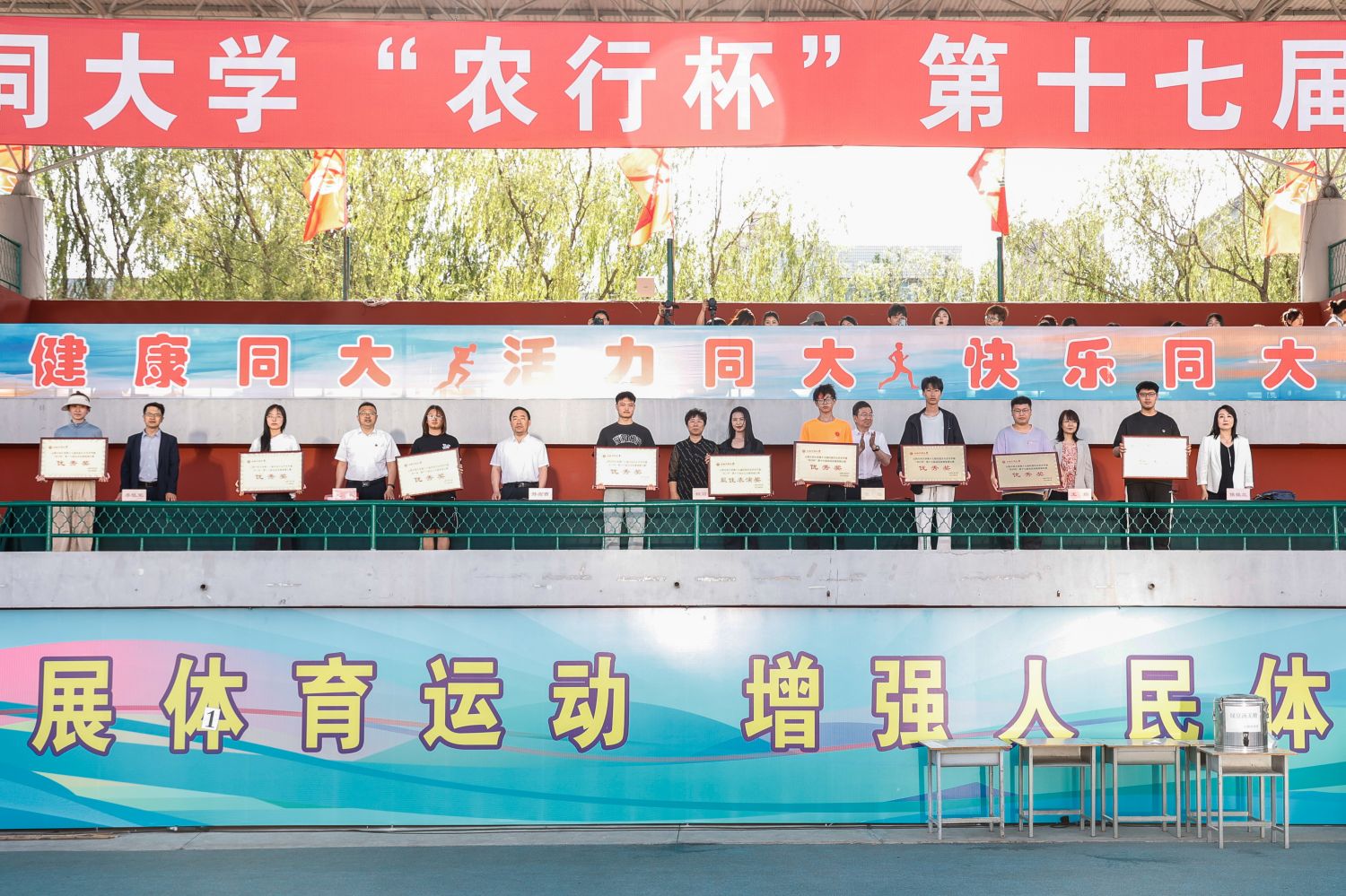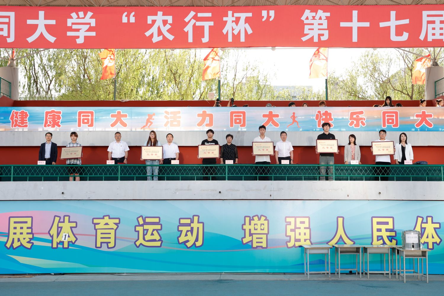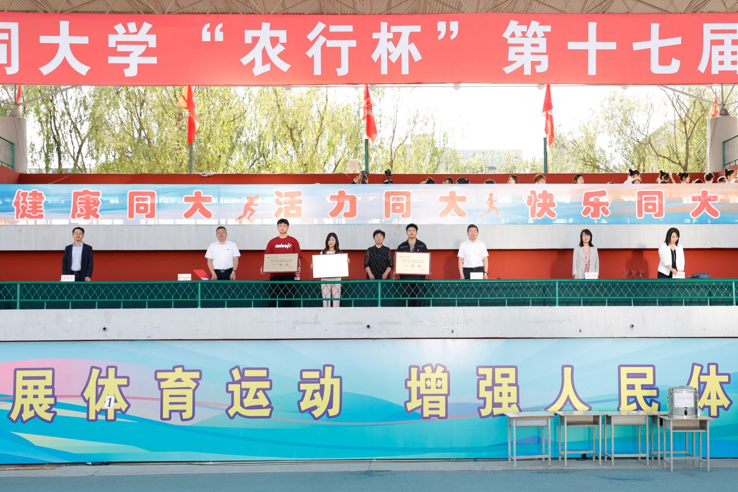 总裁判长赵岷宣布本届运动会比赛成绩。张旻宣布体育道德风尚奖、精神文明奖和新闻报道奖获奖名单。与会领导为获奖集体与个人颁奖。