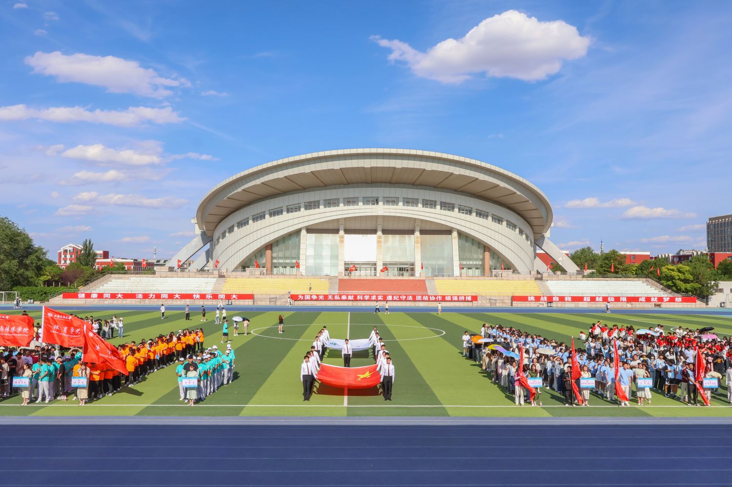 本届运动会历时2天,共设置竞赛、趣味两大类42项比赛项目,全校42支代表队2460余名运动员参加,各项赛事分别在御东校区和新平旺校区进行。期间,选手们全力以赴,奋力拼搏,精彩纷呈,亮点频现。接力赛队员们配合默契,传递棒棍有序,展现团体意识与协作精神;短跑与中长跑选手们奋勇争先,上演速度与激情;蓄力、跳跃、投掷……田赛选手们以高超技艺诠释力与美的完美结合。趣味项目赛场欢声笑语、掌声不断,“红星闪闪”“齐心同行”“同舟共济”,选手们在通力合作中体悟团结与协作;“送军粮”“滚铁环”“螃蟹夹球”,师生们在快乐游戏中展现个人风采。各学院的特色健身操表演,用青春、活力、激情演绎出一幕幕精彩动人的画面,联袂奉献了一场刚与柔碰撞、力与美交织的团体运动盛宴。(文字:赵鑫、王之仪 摄影:安嘉平、余致楠、王孟菲、魏义丹、李芝静 责编:赵鑫)