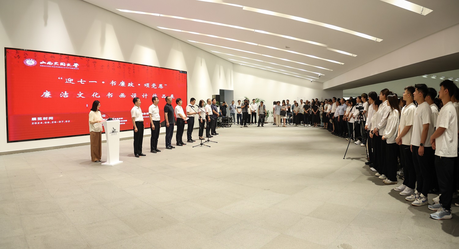 在中国共产党成立103周年来临之际,为进一步深化廉洁文化建设,激励广大师生党员群众不忘初心、牢记使命,永远跟党走,6月28日,由宣传部、组织统战部、美术学院主办,大同市美术馆协办的“迎七一·书廉政·颂党恩”廉洁文化书画设计作品展在市美术馆开幕。校党委书记赵水民,校党委副书记寇福明,大同市美术馆馆长高射出席开幕仪式。