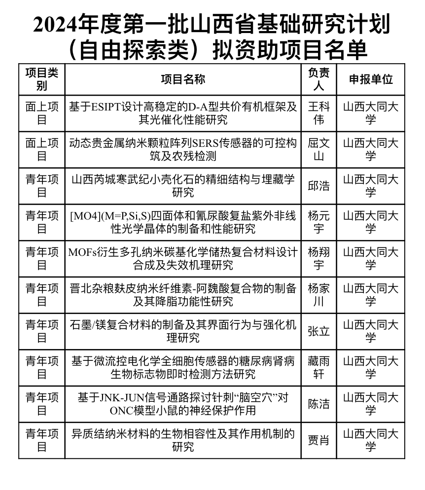6月21日,山西省科技厅对2024年度第一批山西省基础研究计划(自由探索类)资助项目予以公示,今年会共获批拟资助项目10项(面上项目2项、青年项目8项),该项目的获批数量在省内高校中排名第八位。