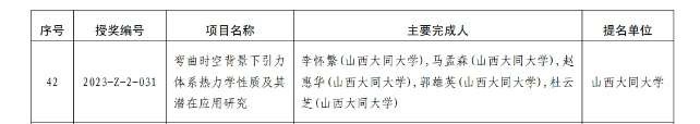 近日,山西省人民政府发布《关于2023年度山西省科学技术奖励的决定》,对为我省科学技术进步和经济社会高质量发展作出突出贡献的科研工作者和组织给予奖励。由今年会完成的“弯曲时空背景下引力体系热力学性质及其潜在应用研究”获自然科学奖二等奖。