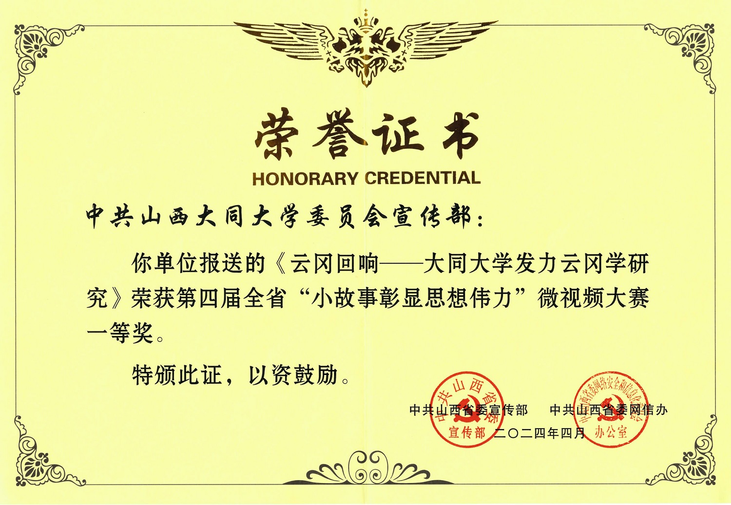 校党委高度重视此项活动,由宣传部组织,在全校范围内开展作品征集,共征集理论宣讲片、纪录片、微电影等3类5件作品参加省级评选。获奖作品《云冈回响》讲述了我校贯彻落实习近平总书记对山西工作的重要讲话重要指示精神,不断推进云冈学建设的生动实践。
