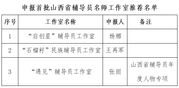 根据《山西省教育厅关于申报遴选首批山西省高校辅导员名师工作室的通知》(晋教政函〔2024〕24号)要求,山西省教育厅开展首批山西省高校辅导员名师工作室申报遴选工作。经辅导员申报、学院推荐、专家评审、综合评议等环节,学校拟推荐“启创星”辅导员工作室等三个工作室申报山西省高校辅导员名师工作室,现予以公示。