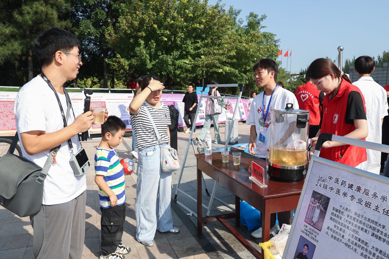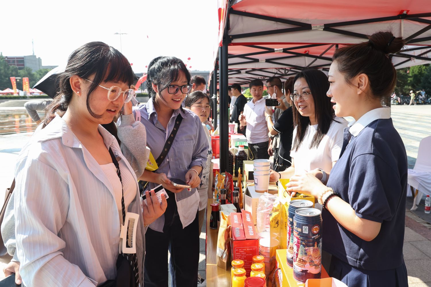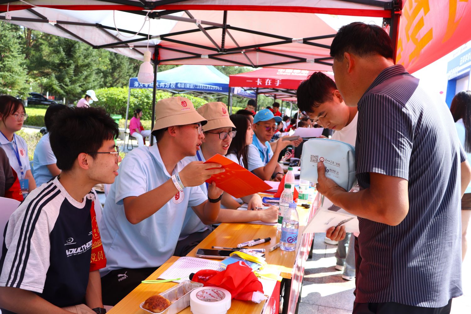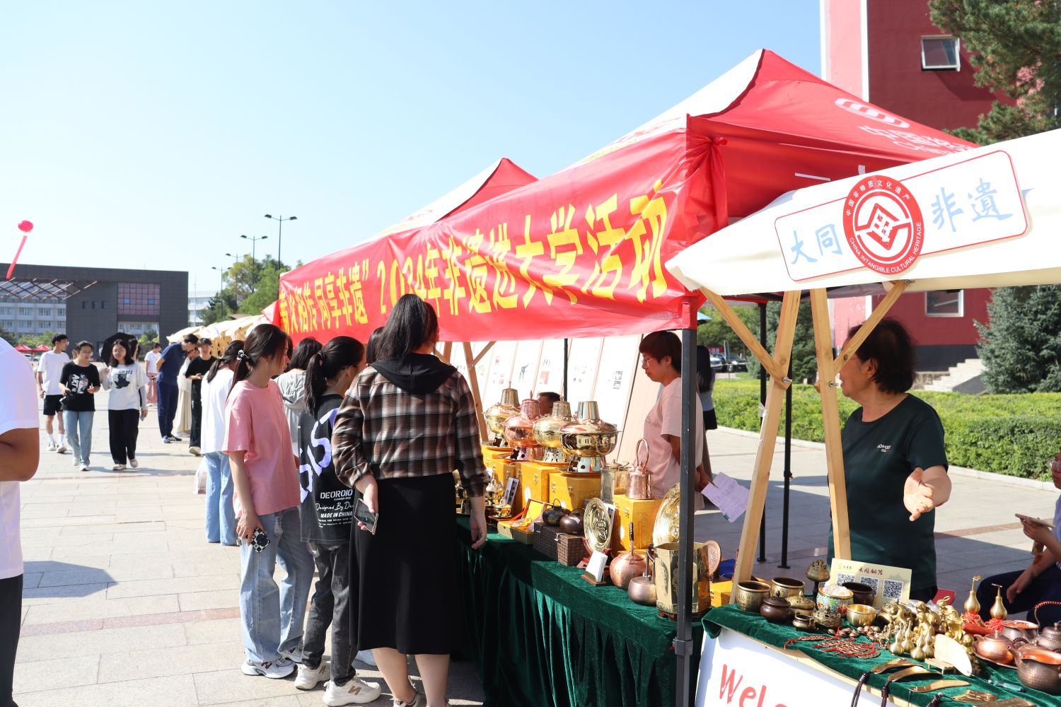 在中校区的迎新现场,有一片区域格外引人关注,“薪火相传 同享非遗”2024年大同非遗进大学活动、“大同好粮”“大同黄花”特优农产品迎新生展示活动正如火如荼地进行着。从“非遗市集”到优质助农产品展示区,大同铜器、蛋雕、皮雕、广灵剪纸等精美非遗技艺赏心悦目,大同黄花、阳高杏脯、恒山黄芪、浑源凉粉等优质助农产品琳琅满目,通过互动式体验、近距离接触,直观生动地将大同文化之深厚、物产之丰饶展现给同大师生。