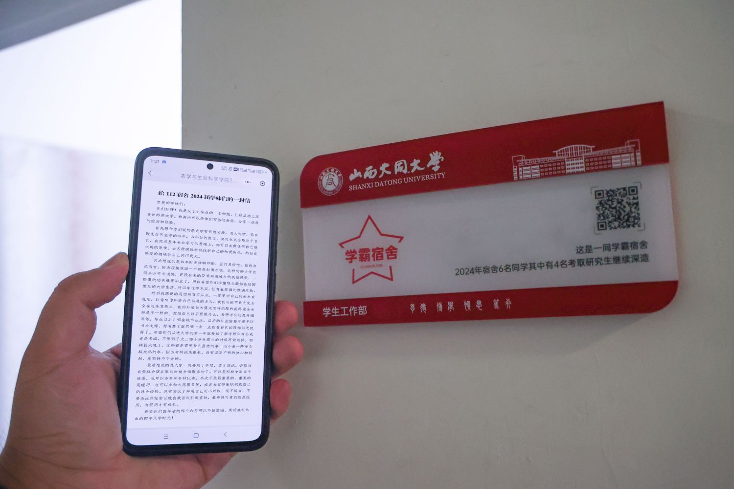 最是传承能致远,最是真诚动人心。今年,学校为新生准备了44间“学霸宿舍”,原住于此的2024届毕业生心怀梦想、励志勤学,则是它们名号的由来。清和苑3号楼112宿舍,便是其中之一,门口的名牌上写着这样一段话:“这是一间学霸宿舍,2024年宿舍6名同学其中有4名考取研究生继续深造。”扫描上面的二维码,是她们写给学妹们的一封信,信中有分享、有忠告、有祝福,朴素的话语,真挚的情感,字里行间是好学笃行的接力,是同大精神的传承。“学校真的太有心了,作为幸运儿,定会将学姐的勉励铭记于心,传承优良学风,走好大学之路。”入住112宿舍的美术学院新生焦箫琪表示。