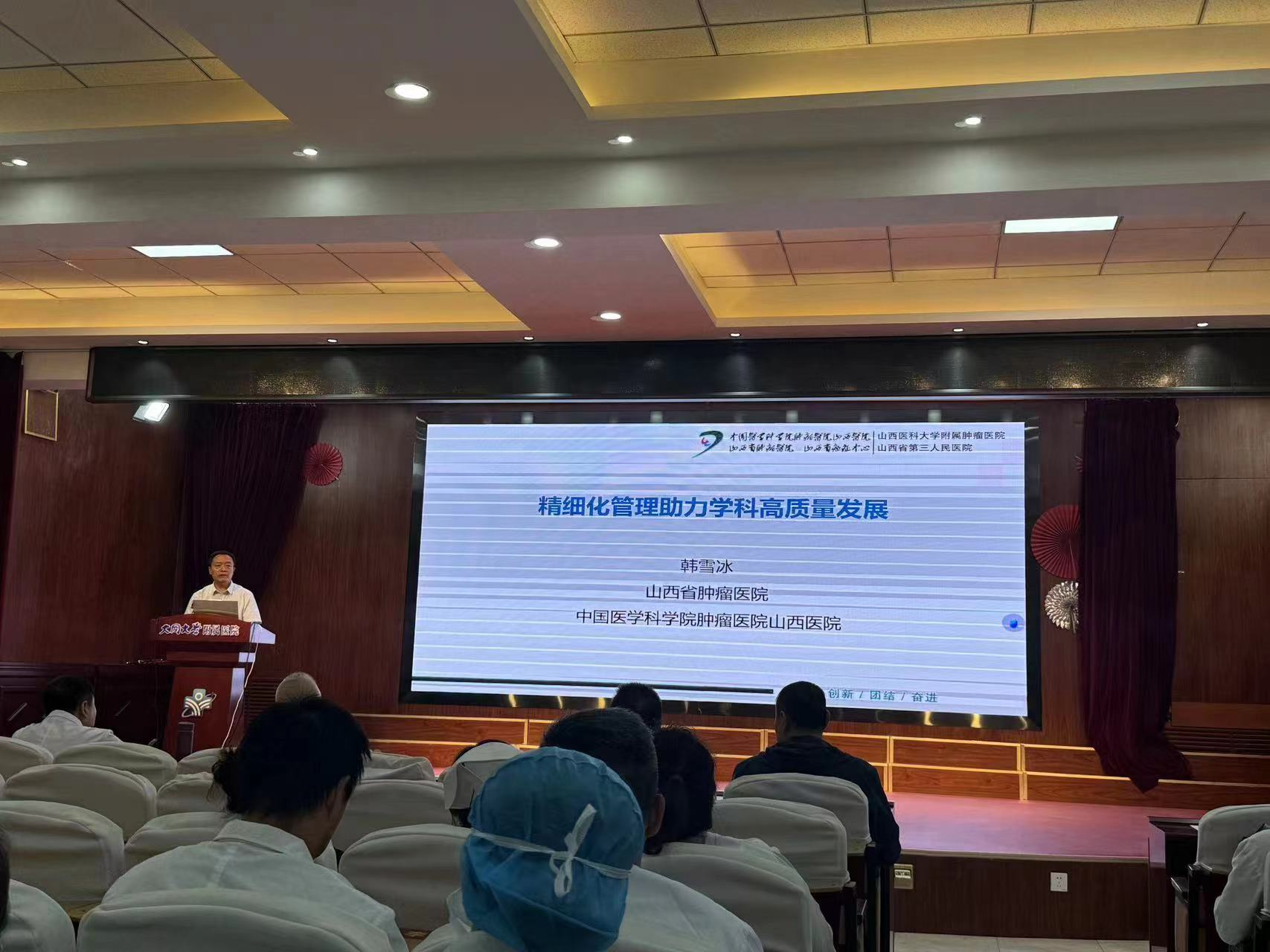 为深入推进中西医结合转型工作和等级医院评审迎评工作,推动医院高质量发展。附属医院于9月4日邀请中国医学科学院肿瘤医院(山西省肿瘤医院)韩雪冰教授来院授课。院党委书记张月东,院党委副书记、院长陈勇,副院长尉洪昌,副院长李鹏出席会议,各职能部门、临床科室负责人及医护人员共计260余人参加培训。