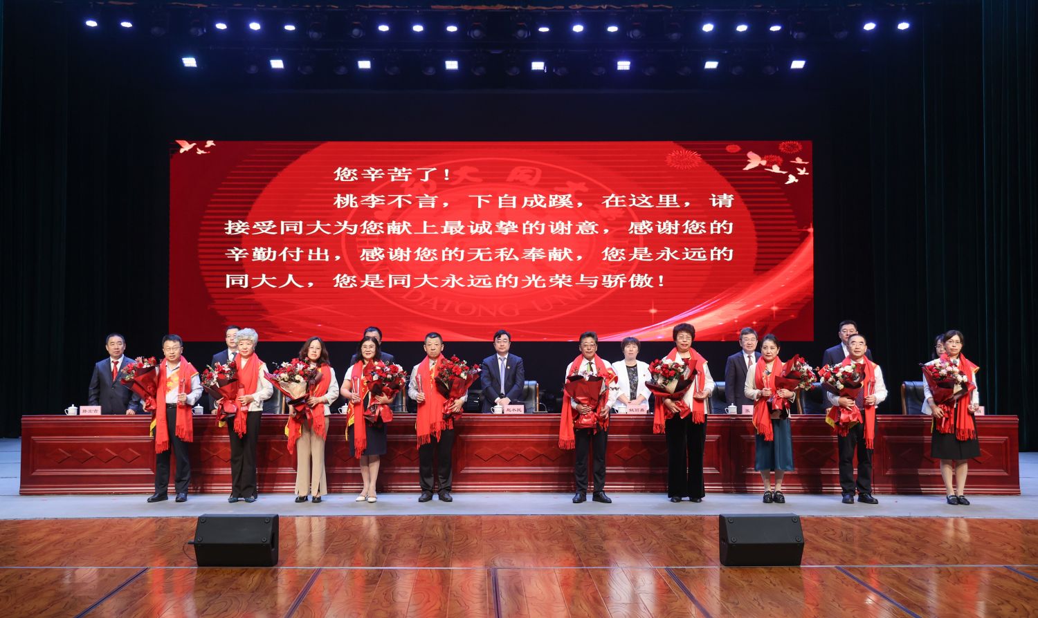 大会为12名退休教师举行荣退仪式,退休教师上台领取荣退证书,并接受新教师和学生代表献礼、献花。“几十年来,您爱岗敬业、默默耕耘、无私奉献……您是永远的同大人,您是同大永远的光荣与骄傲!”情真意切的致敬词,倾诉着学校的真心感谢与诚挚祝福。
