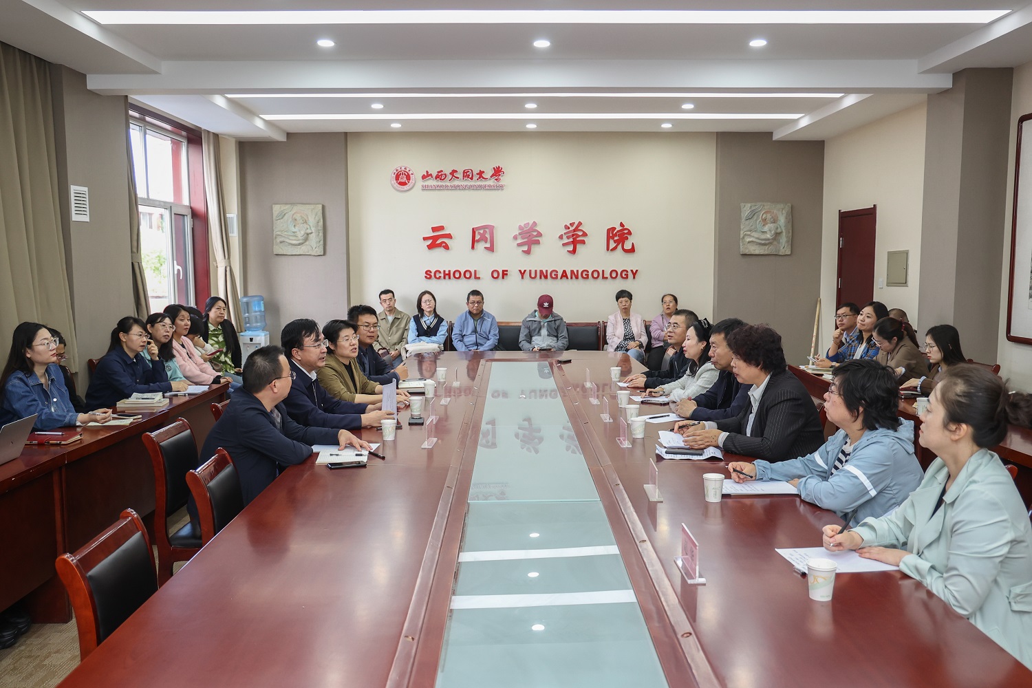 会前,赵水民先后来到云冈学学院职工书屋、文创室、壁画修复实验室、陶瓷修复实验室和壁画临摹实验室,了解学院教学科研、实习实训、平台建设等情况。赵水民在调研时强调,云冈学建设是省委省政府赋予学校的重任,云冈学学院要乘势而上,抓住市校深度融合发展机遇,全力以赴投入到“两院双刊一中心”建设中,做好“大云冈”文章。要加强有组织人才培养、有组织科研与有组织社会服务,擦亮应用型人才培养这块“金字招牌”,要在团队和平台建设上下功夫,进一步拓宽研究视野,凝练研究方向,产出更多云冈学研究标志性成果。要积极“走出去”,转变思路、更新观念,在校地合作项目申报上持续发力,不断加强成果转化,以高质量的社会服务带动云冈学建设高质量发展。