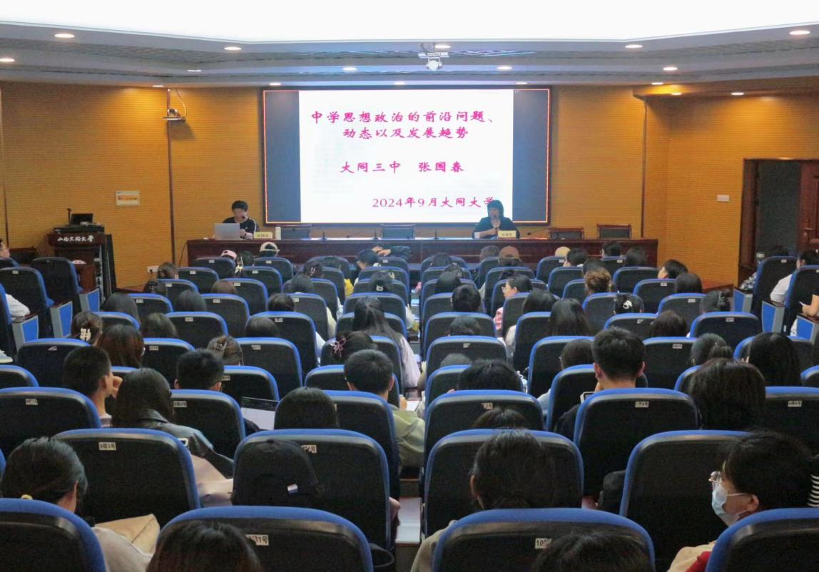 为进一步提高师范生的教师专业素养,提升师范生实践能力,以促进学生全面发展和教学水平进步,9月13日,马克思主义学院举办以“中学思想政治的前沿问题、动态以及发展趋势”为主题的教育研习讲座。本次讲座特邀大同第三中学校张国春老师主讲,马克思主义学院副院长杜海燕主持,思想政治教育专业2021级全体学生参加。