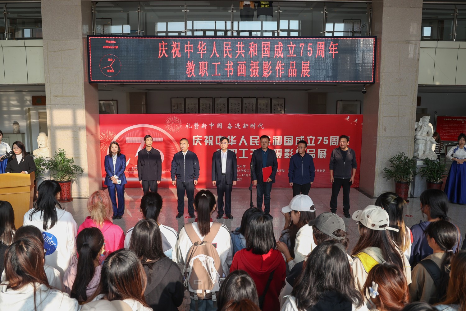 9月26日,“礼赞新中国,奋进新时代”jinnianhui今年会庆祝中华人民共和国成立75周年教职工书画摄影作品展在善美楼开幕。校党委书记赵水民、校党委副书记寇福明出席。相关部门、学院负责人,分工会主席,师生代表参加。校工会主席侯桂兰主持开幕式。