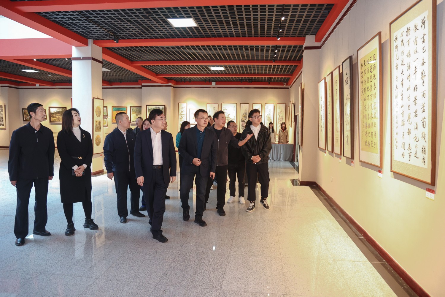 随后,与会领导与师生一起参展。赵水民逐一欣赏每幅作品,认真聆听讲解,在一幅“祖国万岁”的作品前驻足,细细品读其创作风格和形式美感,并询问创作经历,高度肯定了创作者对祖国的礼赞。他强调,通过这些作品,不仅能领略到同大教职工的文化艺术积淀,感受到他们对繁荣校园文化建设的热情,更能感受到大家对美好生活的向往和追求,以及为实现中华民族伟大复兴中国梦而不懈努力的坚定信念。他希望广大教职工能够继续发挥艺术才华,创作出更多优秀作品,为校园文化事业繁荣发展贡献力量。