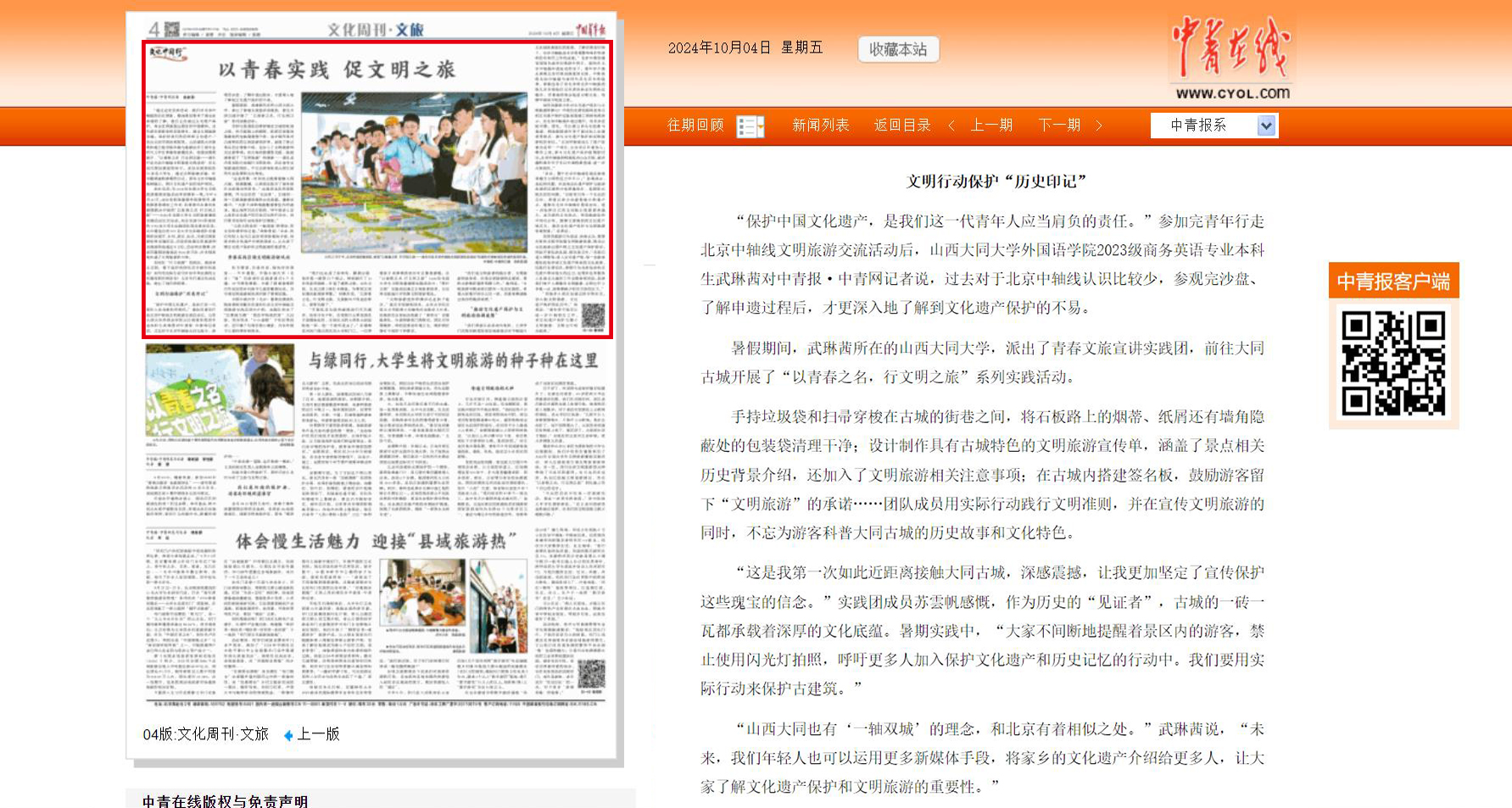 “手持垃圾袋和扫帚穿梭在古城的街巷之间,将石板路上的烟蒂、纸屑还有墙角隐蔽处的包装袋清理干净;设计制作具有古城特色的文明旅游宣传单,涵盖了景点相关历史背景介绍,还加入了文明旅游相关注意事项;在古城内搭建签名板,鼓励游客留下‘文明旅游’的承诺……团队成员用实际行动践行文明准则,并在宣传文明旅游的同时,不忘为游客科普大同古城的历史故事和文化特色。”中青报·中青网记者描述今年会实践团活动开展情况。