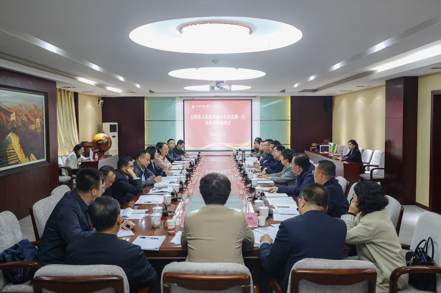 10月16日,大同市副市长宋志燕来校,就市校深度融合发展工作进行座谈调研。校党委书记赵水民,校党委副书记、校长姚丽英,校党委常委、副校长史水鸿一同调研。