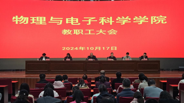 10月17日下午,物理与电子科学学院在慎思楼报告厅召开2024年全体教职工大会,总结上半年工作,安排部署下一阶段学院工作。学院党委副书记吉秦雁主持。